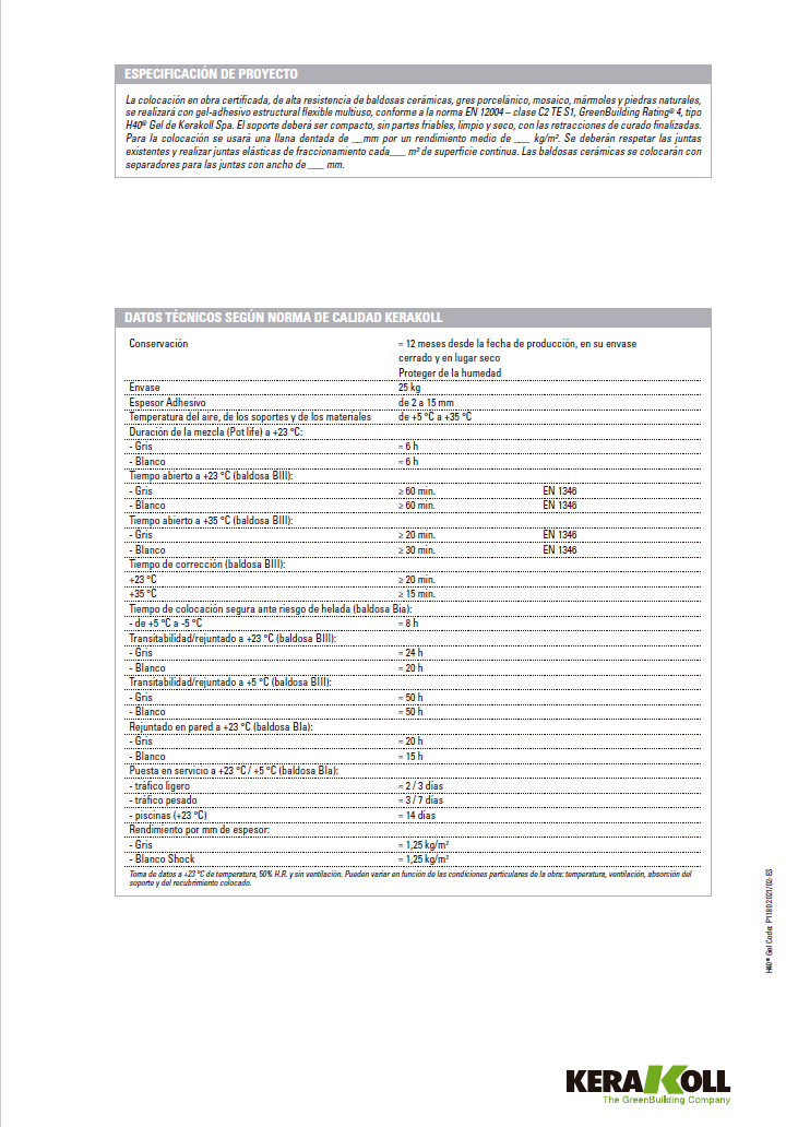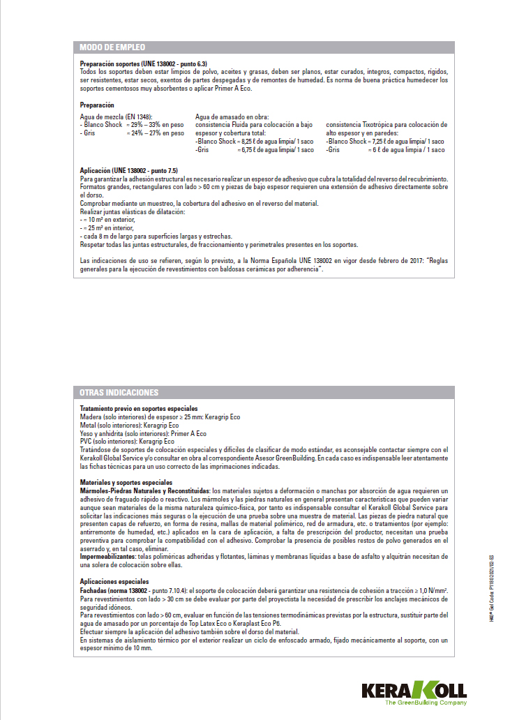 Respetar todas las juntas estructurales, de fraccionamiento y perimetrales presentes en los soportes. Las indicaciones de uso se refieren, según lo previsto, a la Norma Española UNE 138002 en vigor desde febrero de 2017: “Reglas generales para la ejecución de revestimientos con baldosas cerámicas por adherencia”.