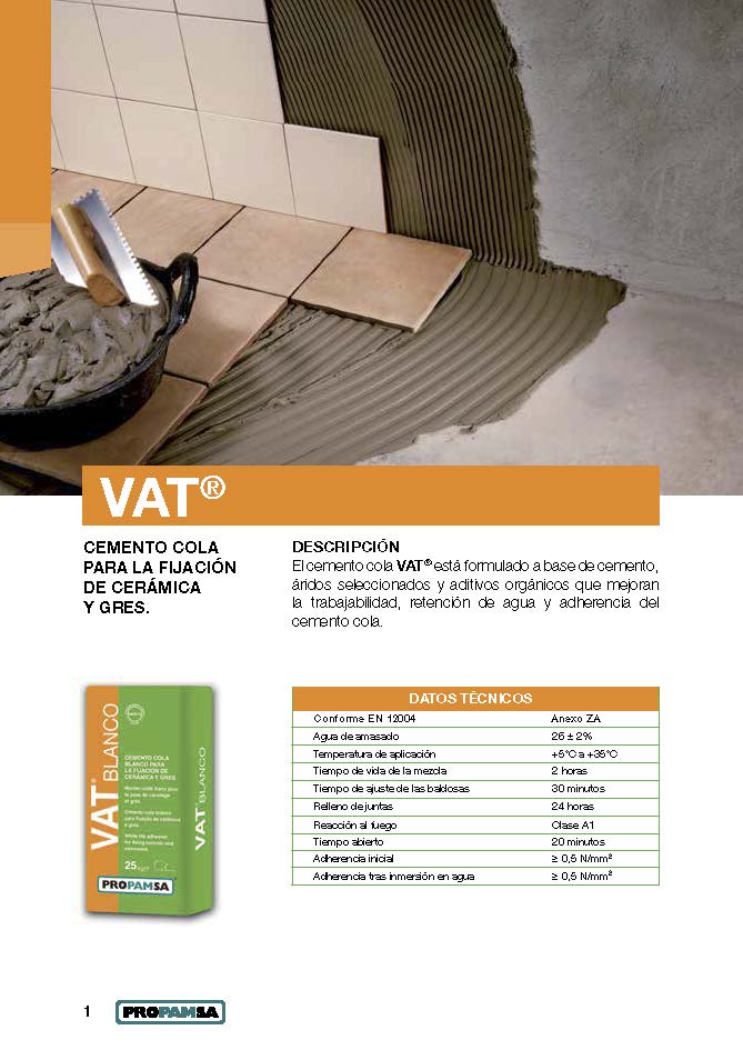 El cemento cola VAT® está formulado a base de cemento, áridos seleccionados y aditivos orgánicos que mejoran la trabajabilidad, retención de agua y adherencia del cemento cola.