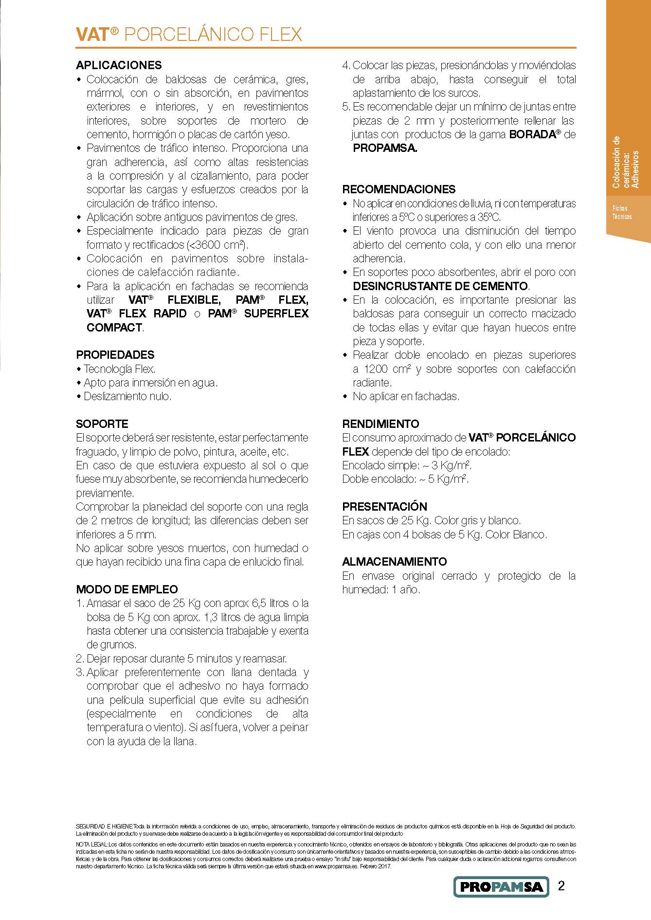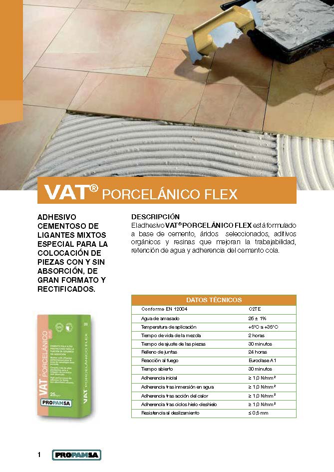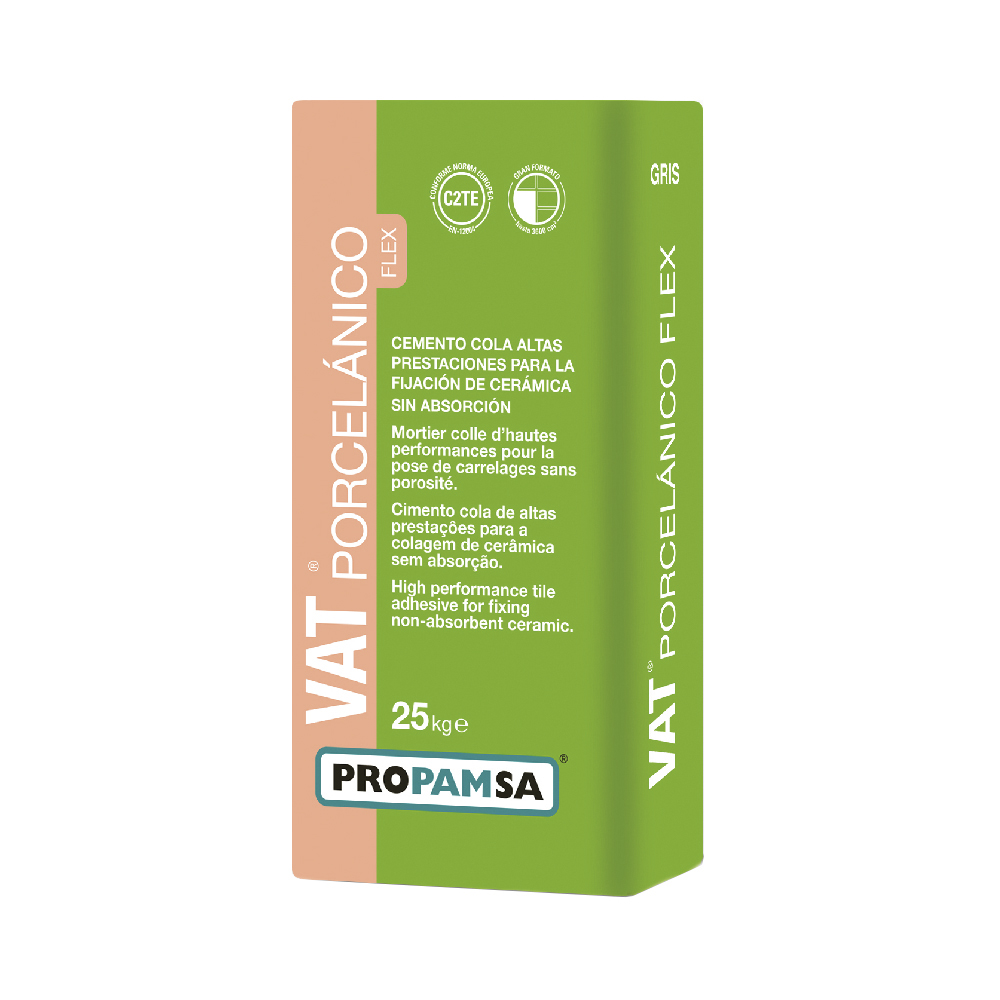El adhesivo VAT® PORCELÁNICO FLEX está formulado a base de cemento, áridos seleccionados, aditivos orgánicos y resinas que mejoran la trabajabilidad, retención de agua y adherencia del cemento cola.