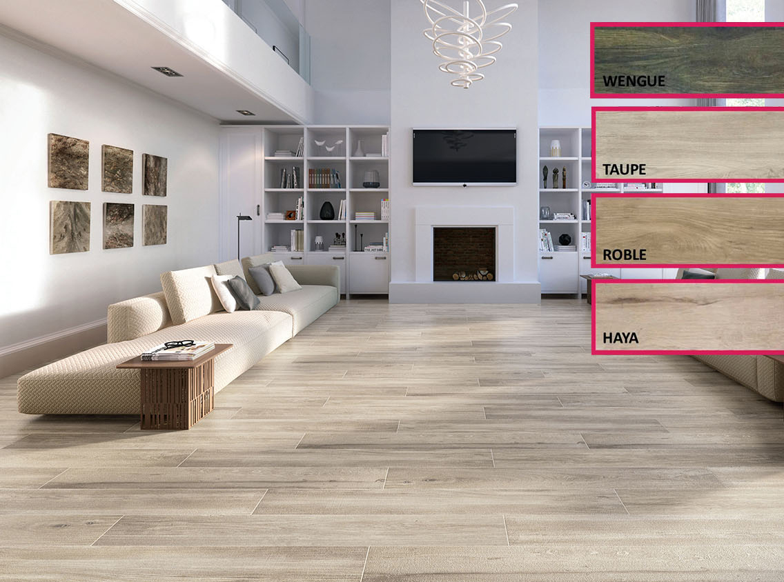 Este porcelánico imitación madera aporta un ambiente original y cálido, combinando diferentes tonalidades como Haya, Roble, Taupe y Wengue. Su acabado natural y mate ofrece una apariencia auténtica y elegante, ideal para cualquier estilo decorativo.
