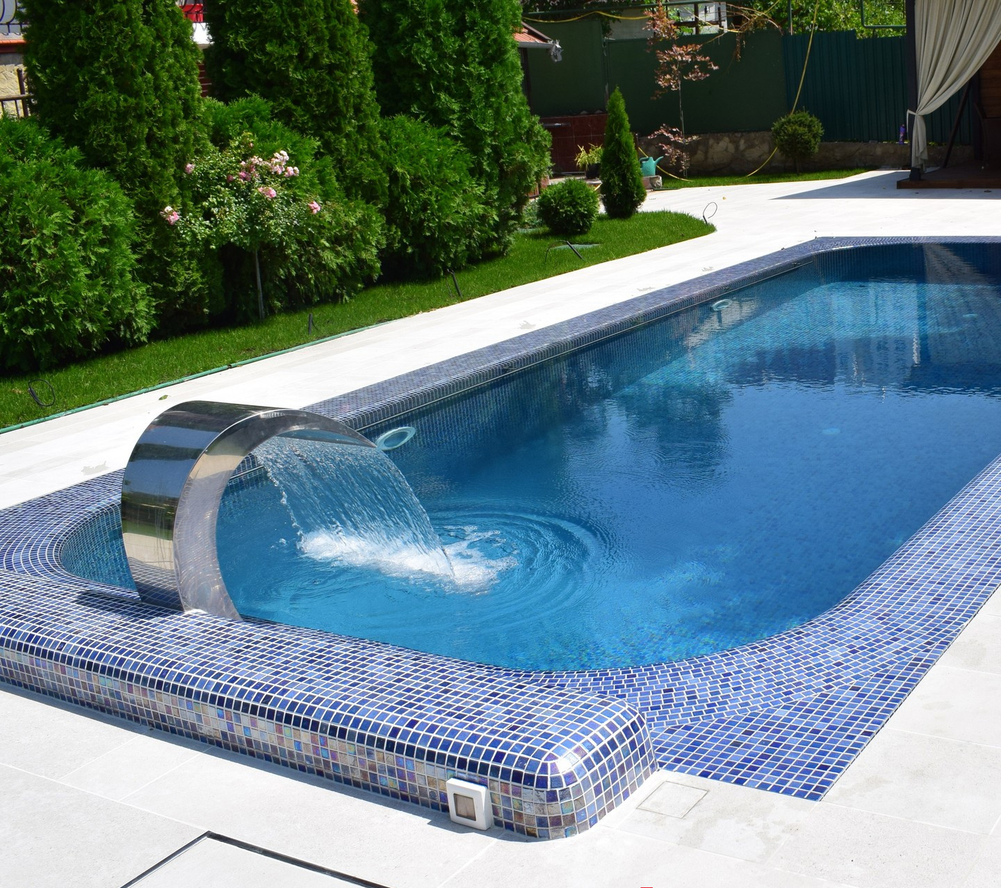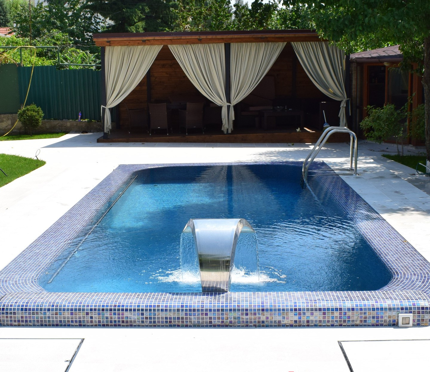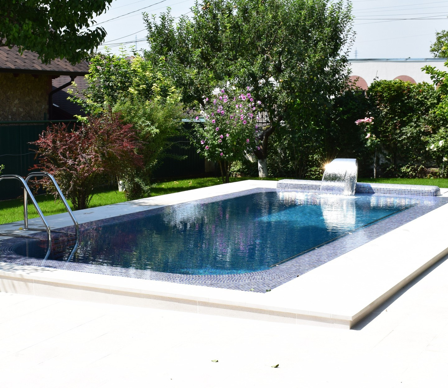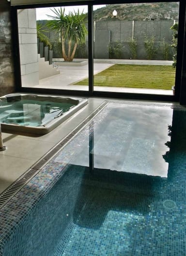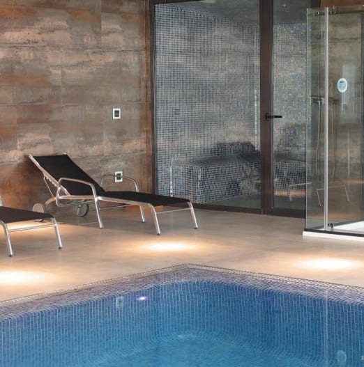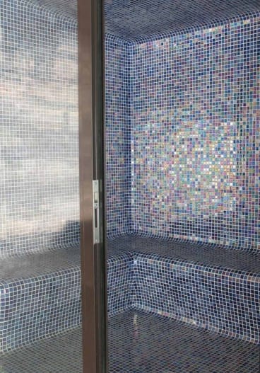 Estos azulejos en una pequeña piscina interior han quedado fenomenales, con las luces emiten un brillo discotequero muy gracioso. Estamos contentos.