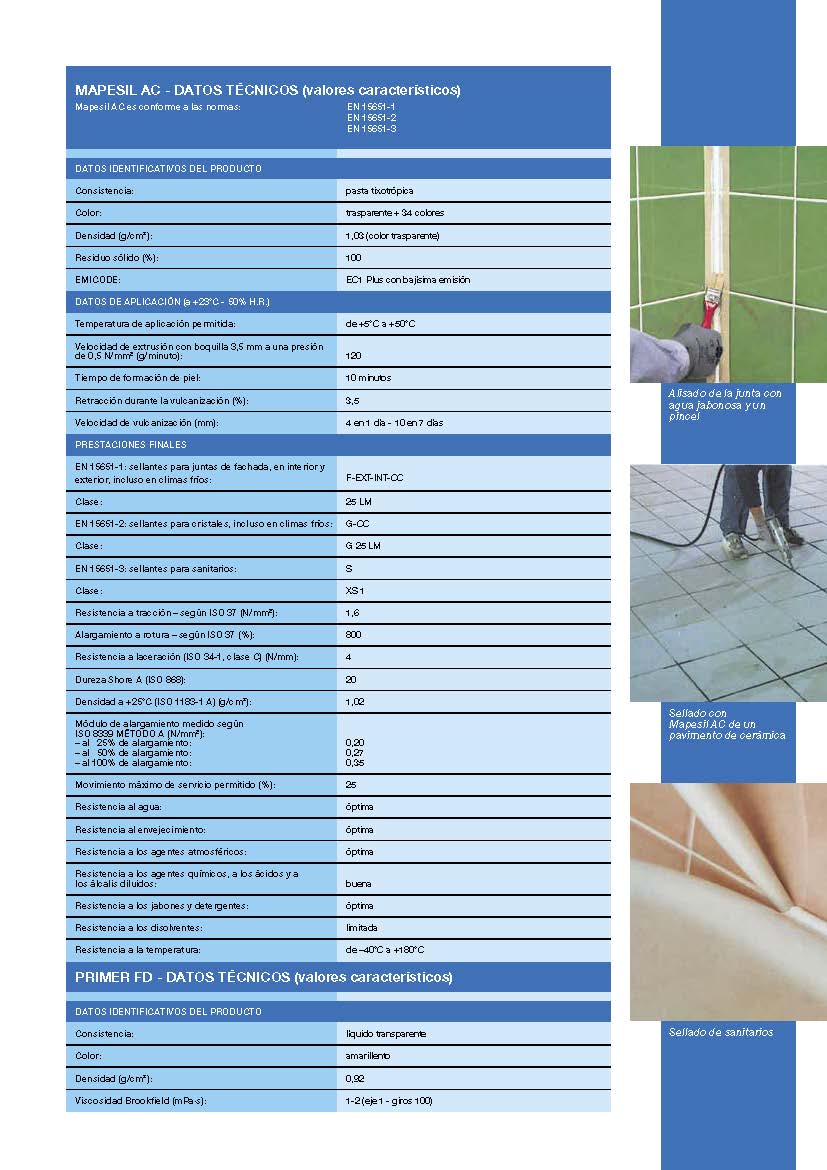 Mapesil AC, sellador silicónico, monocomponente, transparente o coloreado, de reticulación acética, exento de disolventes, se presenta como una pasta tixotrópica, de fácil aplicación tanto en horizontal como en vertical, que retícula con la humedad atmosférica, a temperatura ambiente, formando un producto elástico con las siguientes propiedades: