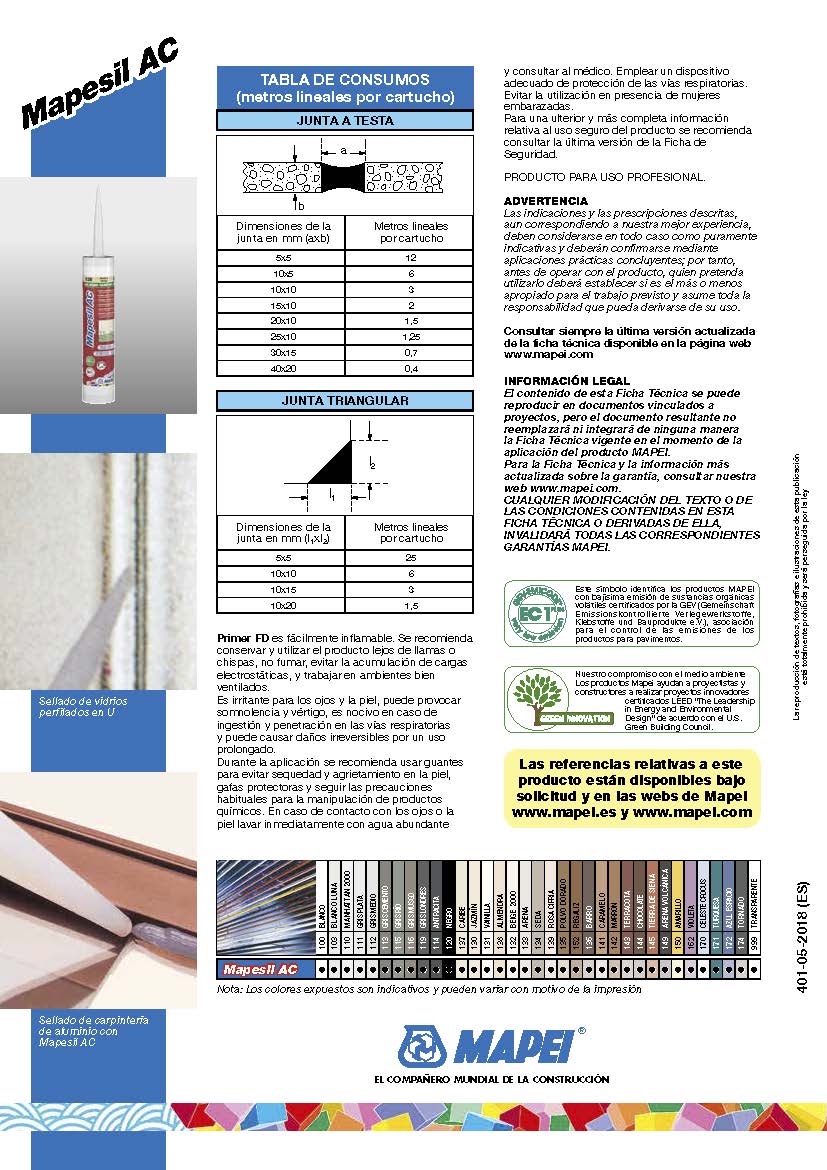 Mapesil AC es un sellador silicónico, de reticulación acética, idóneo para sellar vidrio, cerámica y aluminio anodizado; previo tratamiento con un promotor de adherencia. Primer FD, puede ser utilizado también sobre hormigón, madera, metal, superficies pintadas, materias plásticas y goma. Mapesil AC se usa para: