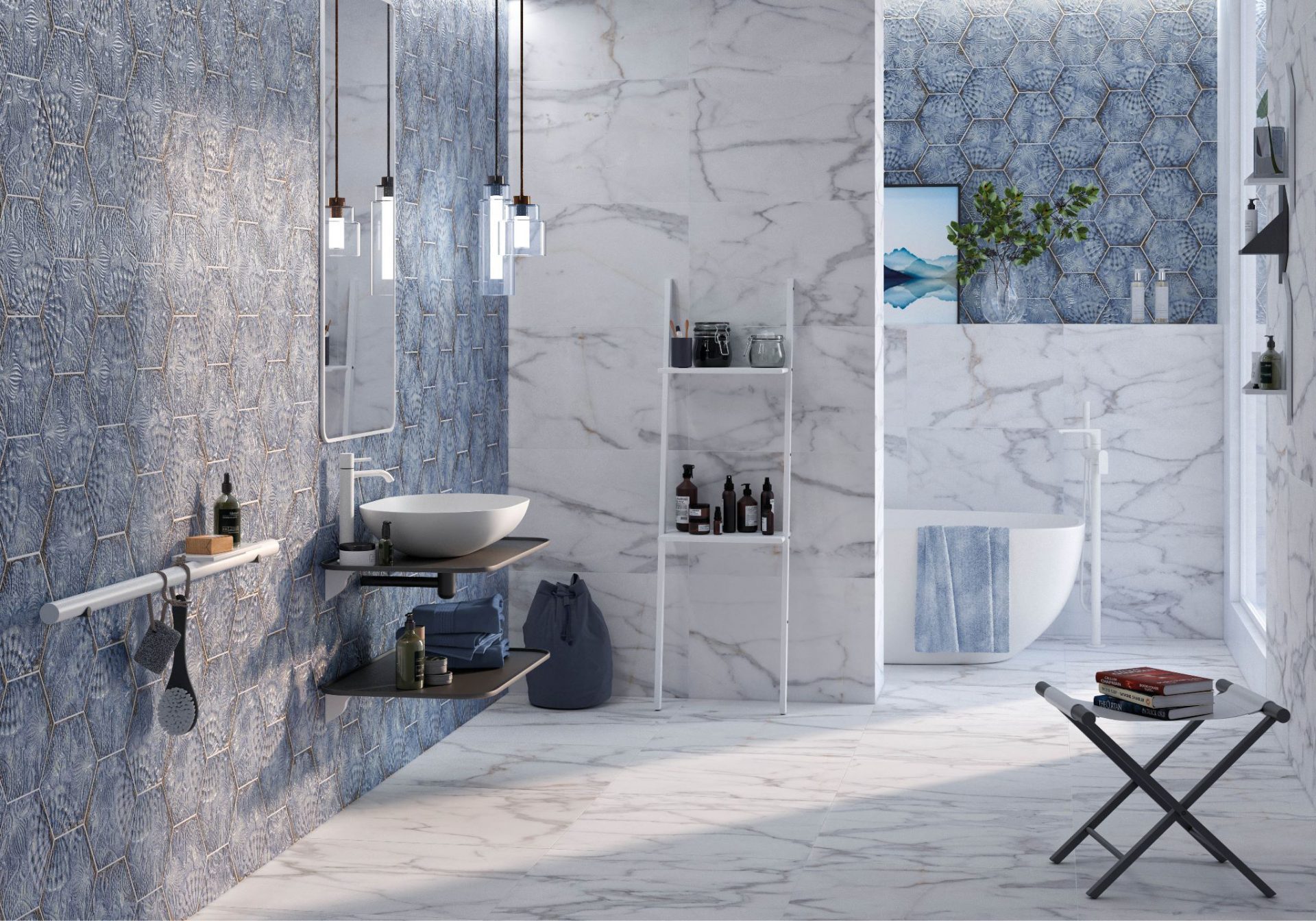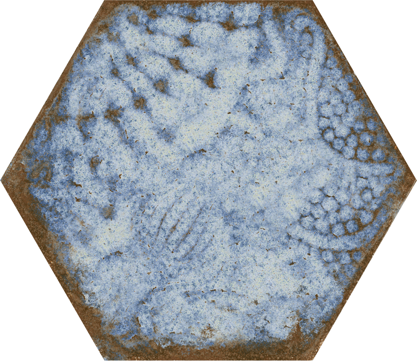La Serie GAUDI REACTIVE MARINA es un azulejo porcelánico tipo hidráulico en formato 22×25 hexagonal, Presenta un acabado brillo.