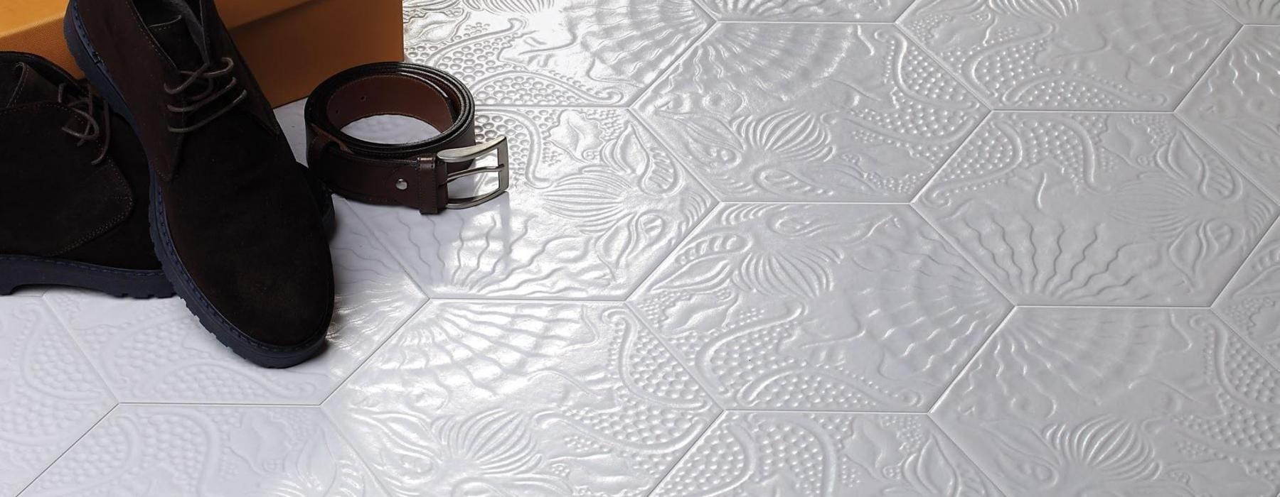 Serie GAUDI . Azulejo porcelánico tipo hidráulico en formato 22×25 hexagonal, Presenta un acabado mate.