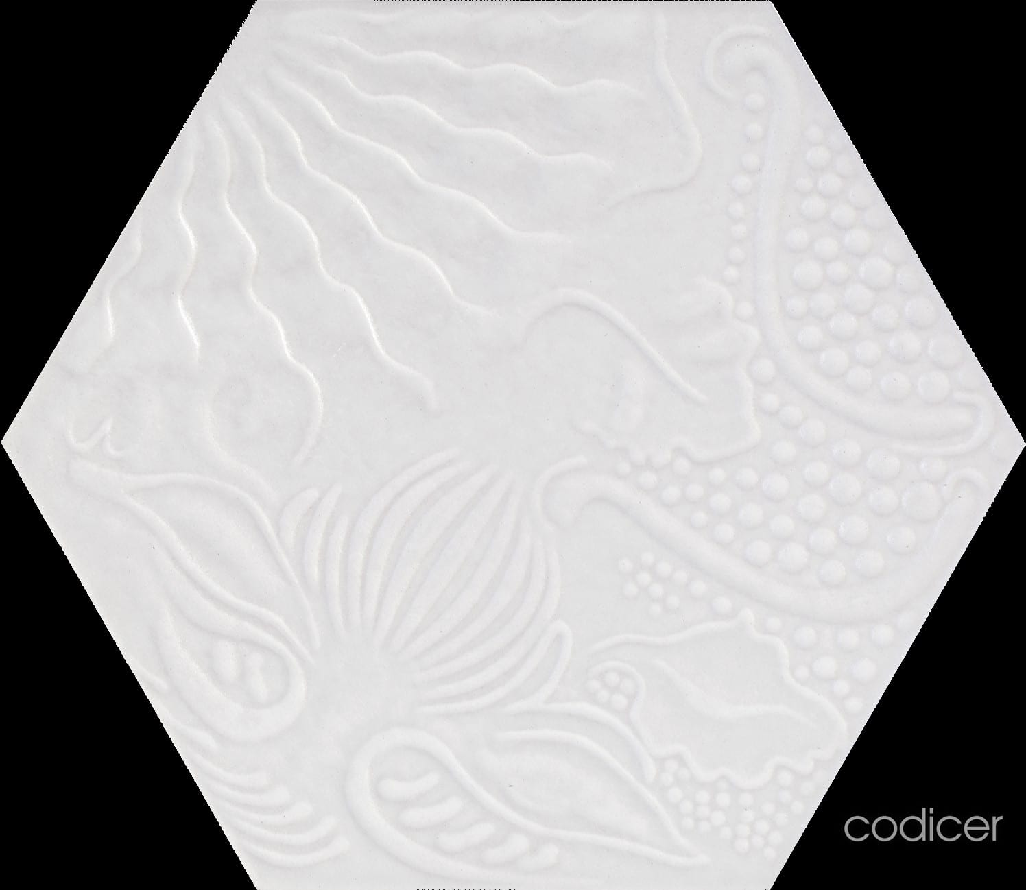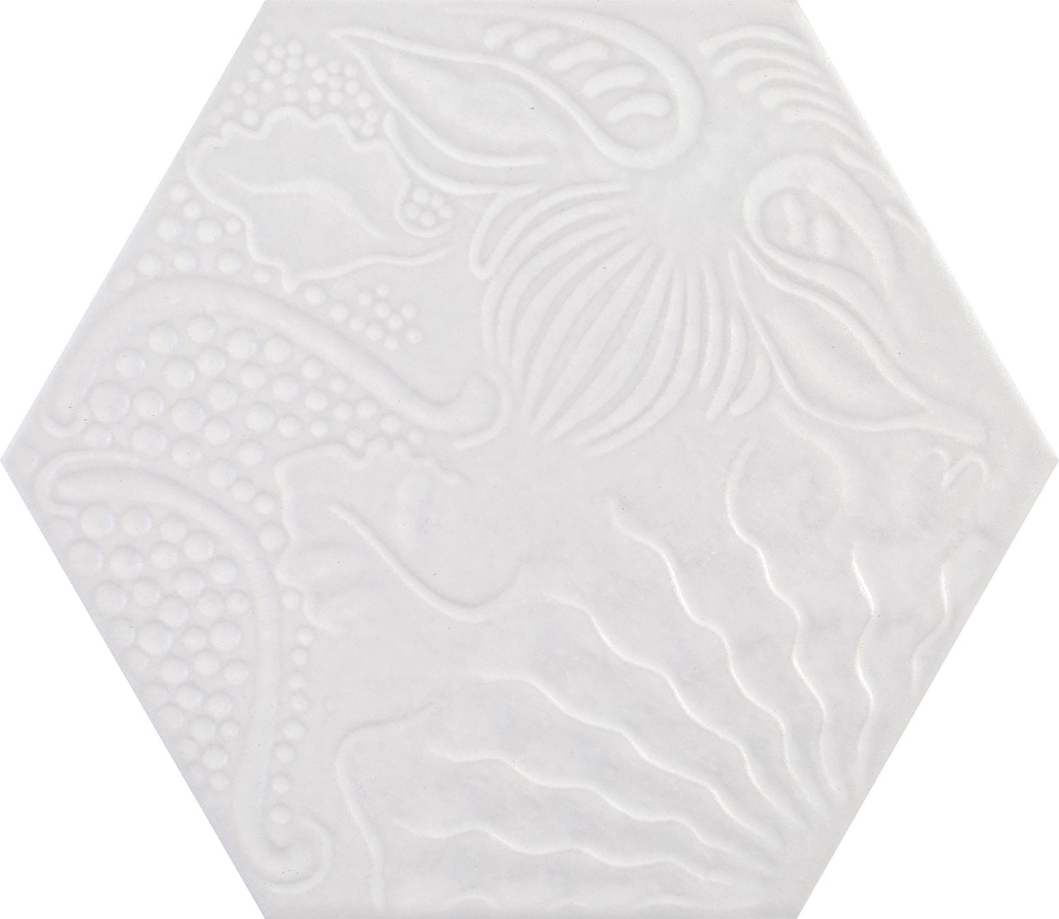 La Serie GAUDI es un azulejo porcelánico tipo hidráulico en formato 22×25 hexagonal, presenta un acabado mate y color White. Dispone de decorado con relieve.