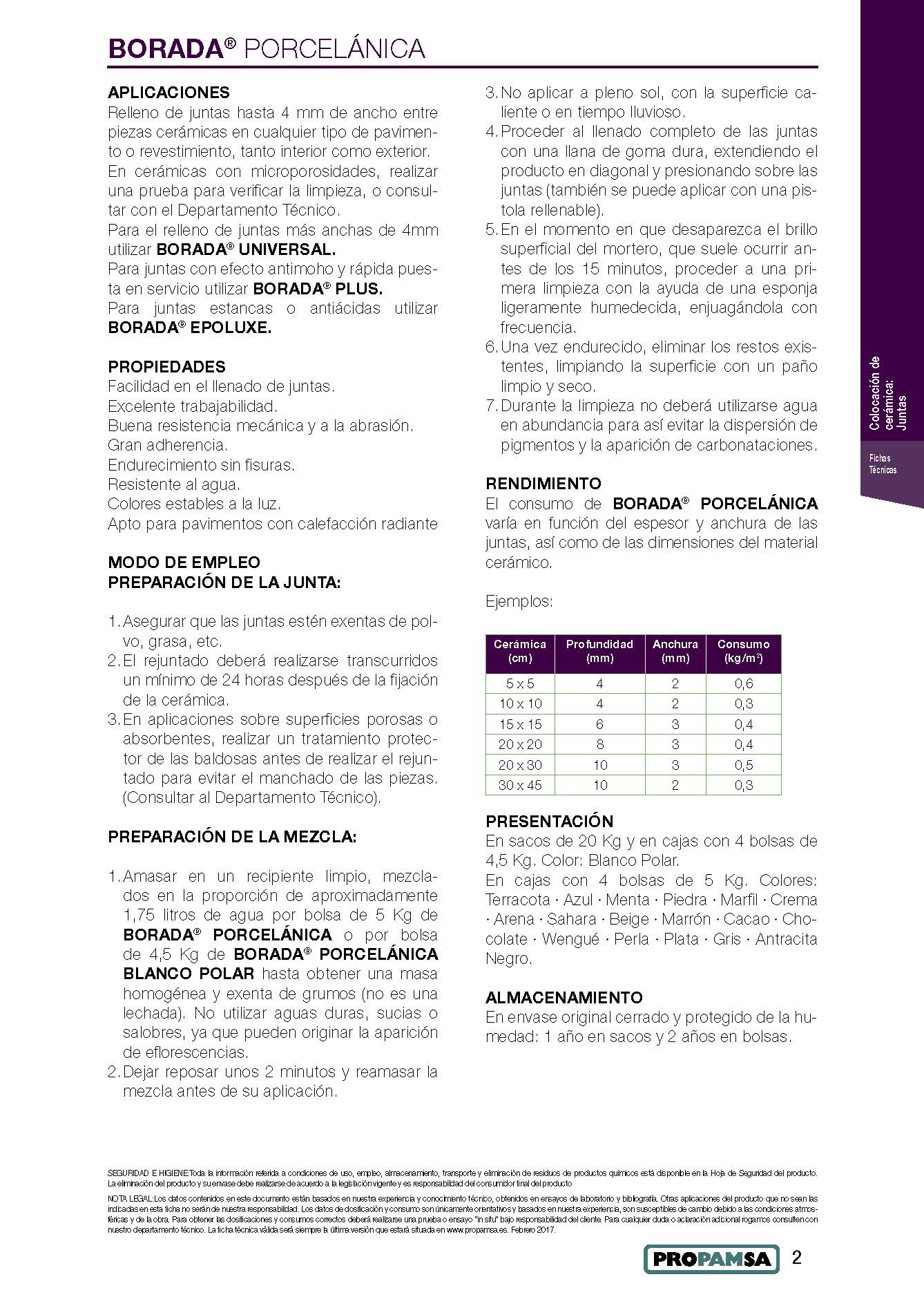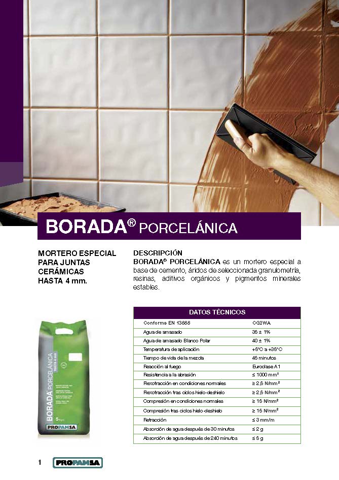 BORADA® PORCELÁNICA es un mortero especial a base de cemento, áridos de seleccionada granulometría, resinas, aditivos orgánicos y pigmentos minerales estables.