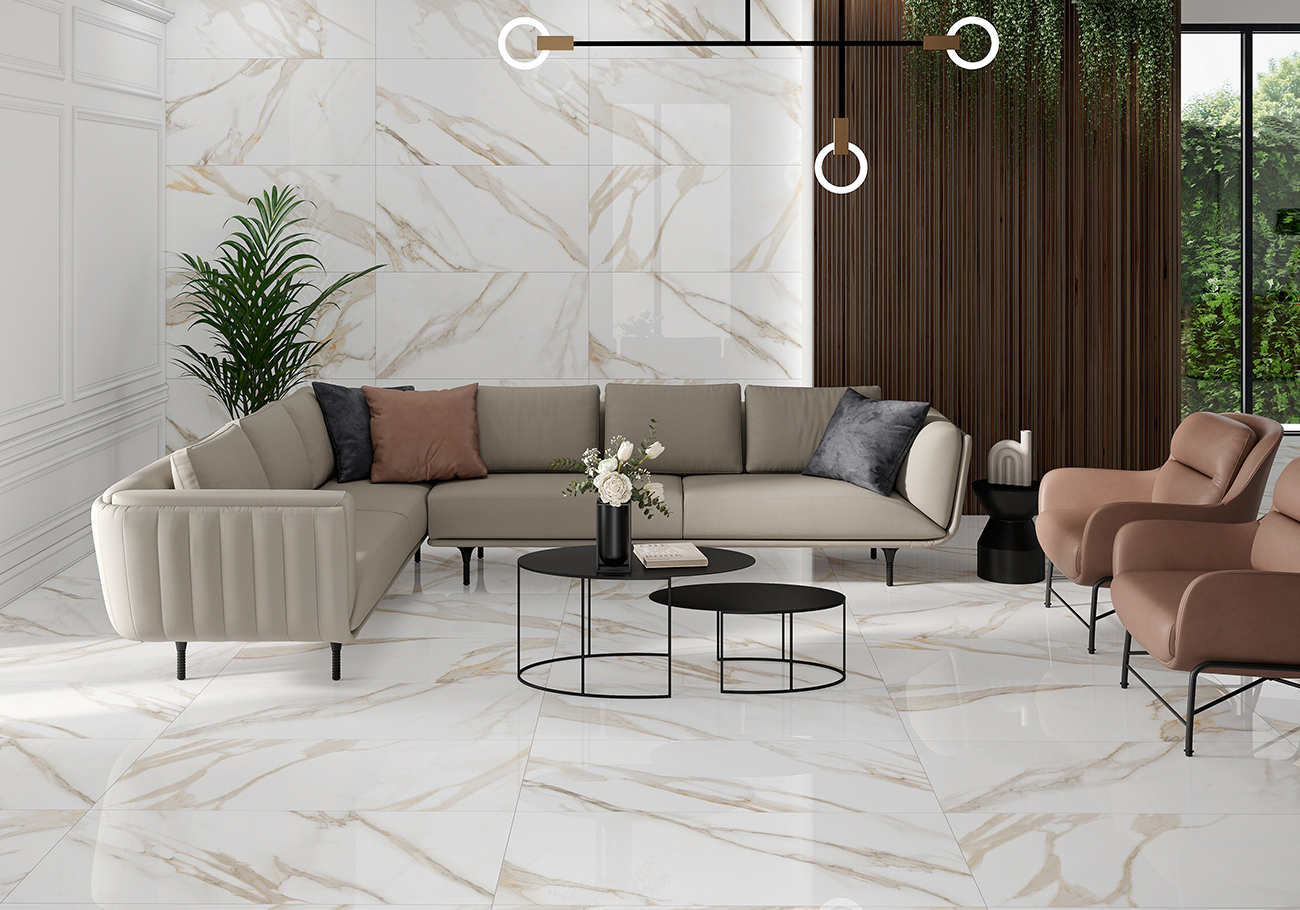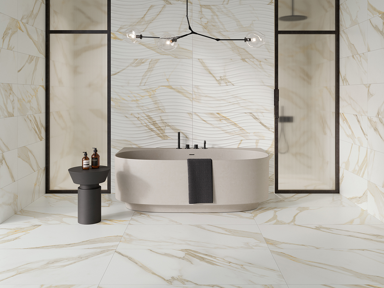La serie ofrece una amplia variedad de formatos y acabados para adaptarse a diferentes estilos decorativos. Los formatos 120×120 cm y 60×120 cm están disponibles en un acabado pulido rectificado, que destaca por su brillo intenso y la profundidad de sus vetas, creando una atmósfera luminosa y elegante en cualquier espacio. Por otro lado, los formatos 100×100 cm y 60×120 cm presentan un acabado satinado rectificado, ideal para quienes buscan un aspecto más suave y mate, sin renunciar a la sofisticación del mármol.