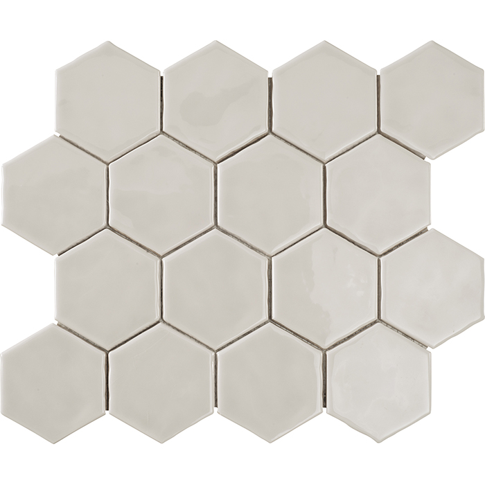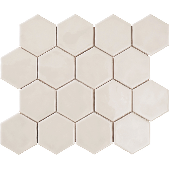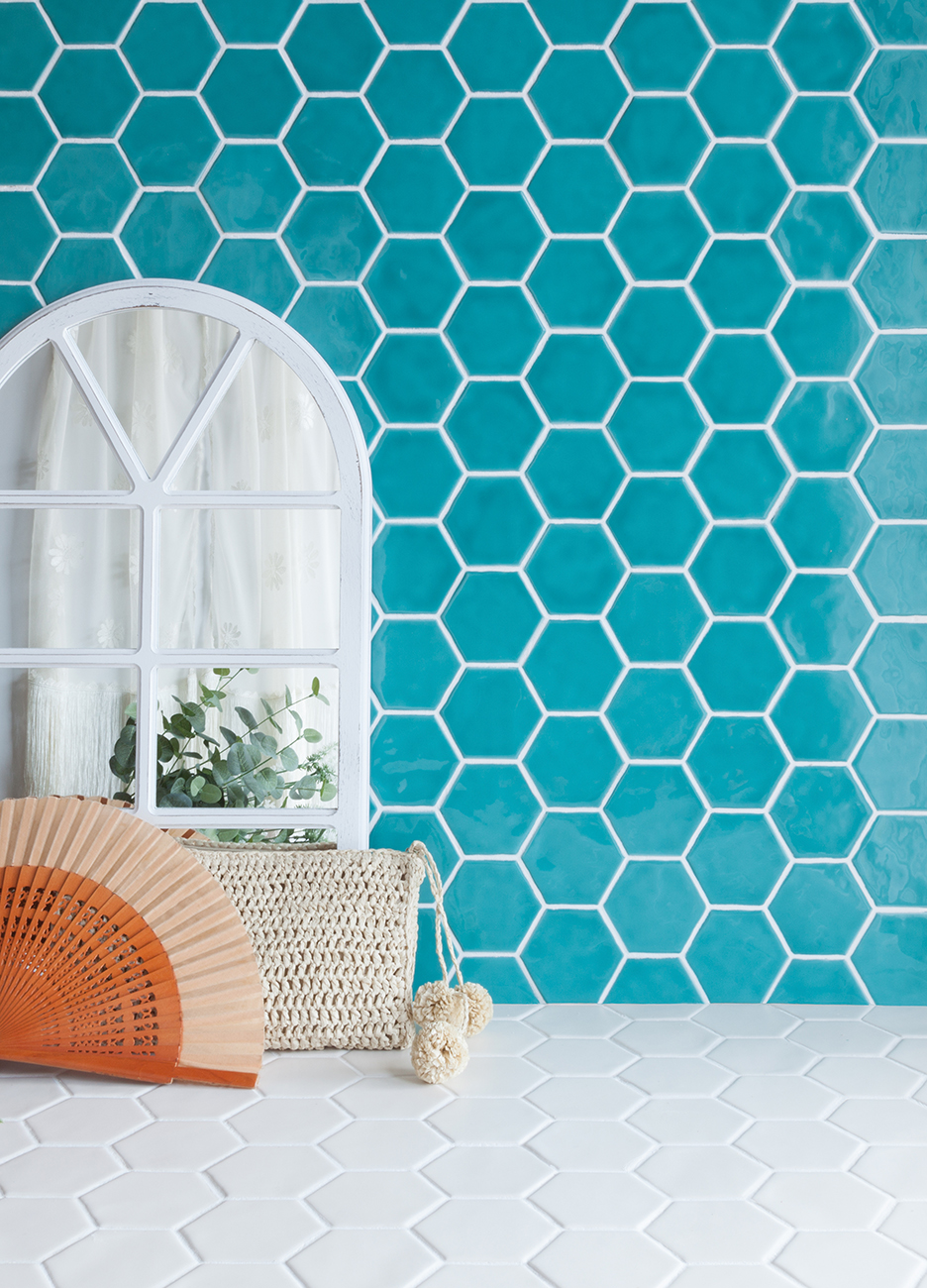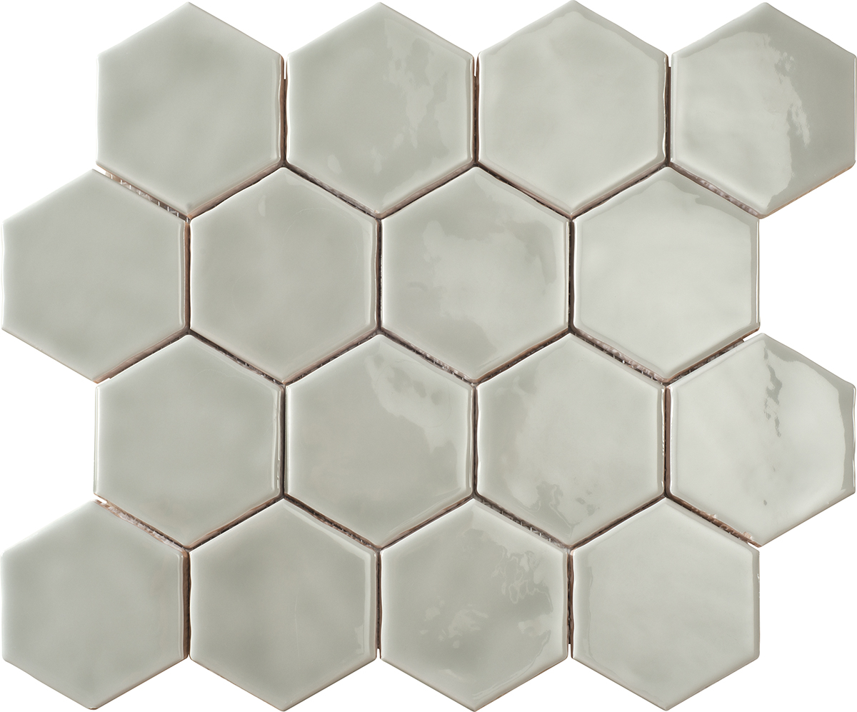 Revestimiento hexagonal de 79x91x9mm pegado en mallas de 32×28 cm. Producto artesanal de doble cocción, elaborado con esmaltes naturales. Colores con gran variación de tonos . Formato pequeño y agradable a la vista, único en el mercado. Acabado brillo. Agradable al tacto. Borde recto. Superficie ligeramente irregular, suave efecto rústico. Producto enmallado para una colocación fácil y rápida. Apto para paredes interiores o paredes protegidas de las heladas. Apto para paredes en cabinas de ducha. Uso residencial o comercial. Estilos Loft , rústico ibicenco y Art Decó.