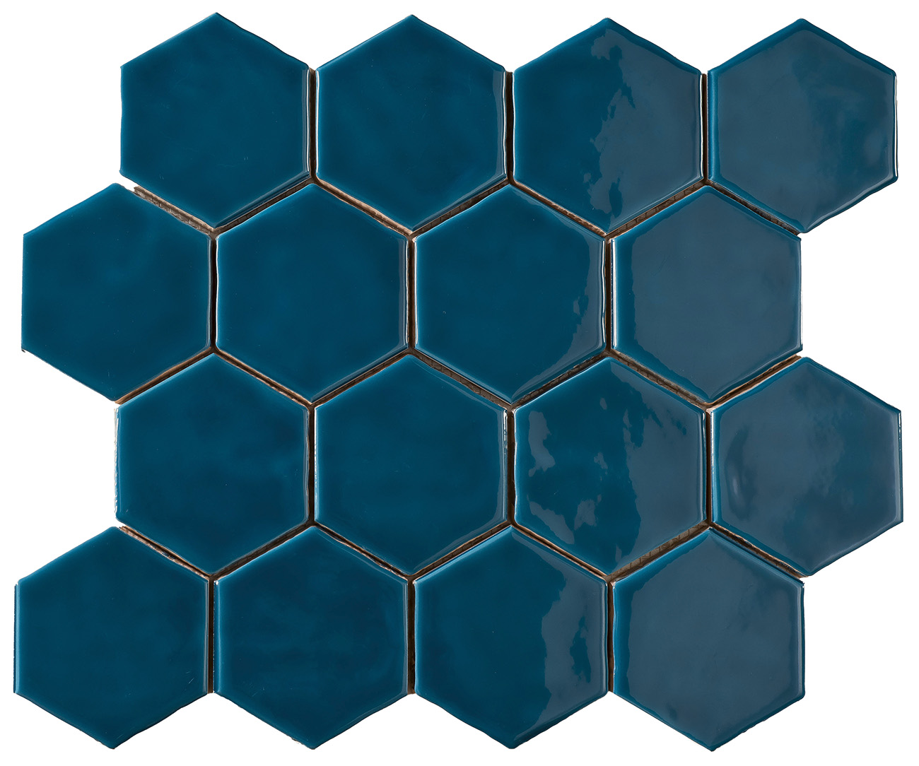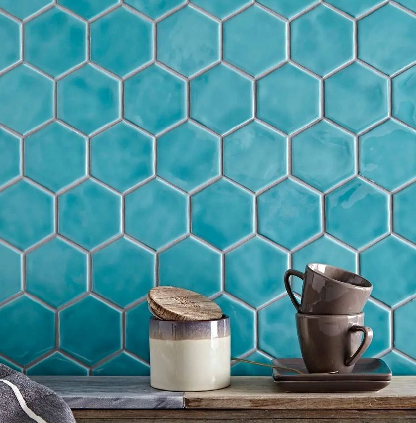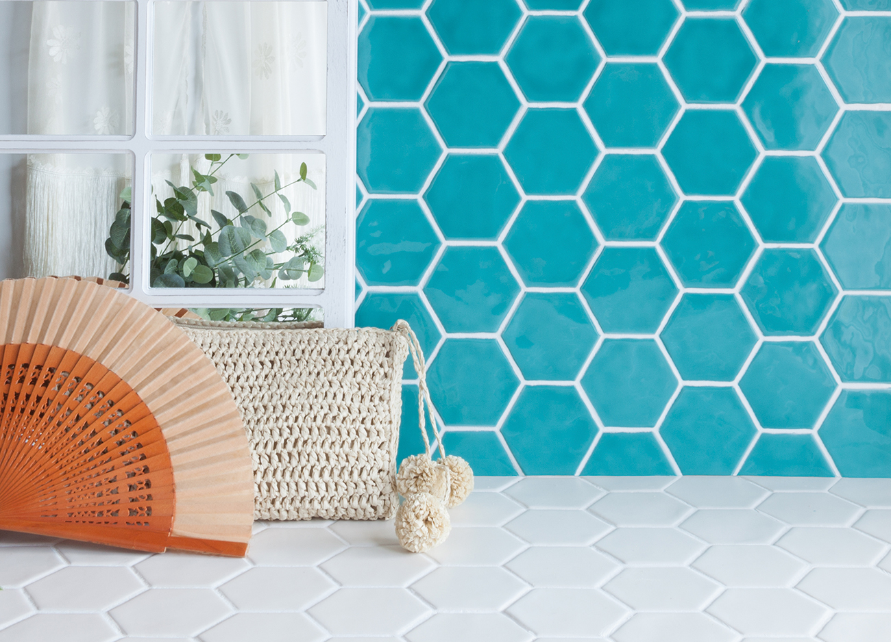 Revestimiento hexagonal de 79x91x9mm pegado en mallas de 32×28 cm. Producto artesanal de doble cocción, elaborado con esmaltes naturales. Colores con gran variación de tonos . Formato pequeño y agradable a la vista, único en el mercado. Acabado brillo. Agradable al tacto. Borde recto. Superficie ligeramente irregular, suave efecto rústico. Producto enmallado para una colocación fácil y rápida. Apto para paredes interiores o paredes protegidas de las heladas. Apto para paredes en cabinas de ducha. Uso residencial o comercial. Estilos Loft , rústico ibicenco y Art Decó.