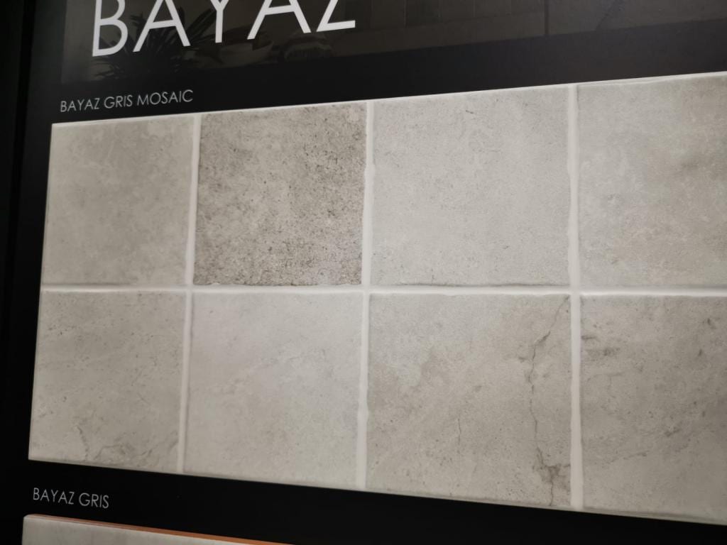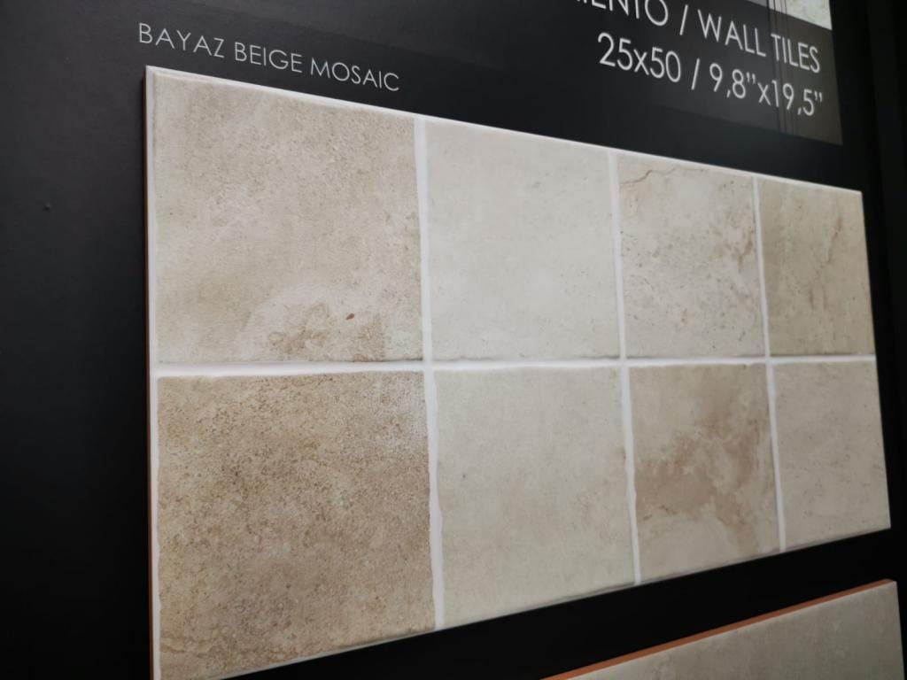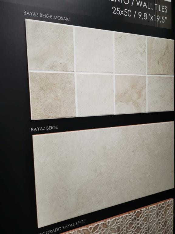 10,79 € – 11,22 € / m2 (IVA Incluido)La Serie BAYAZ es un azulejo tipo cementoso de pasta roja con acabado mate. Lo podemos encontrar para paredes en formato 25×50 y para pavimentos tenemos un 45×45. Los colores de esta serie son: Beig, Beig Mosaic – Blanco – Gris, Gris Mosaic . Para revestimiento podemos encontrar diferentes decorados para combinar.