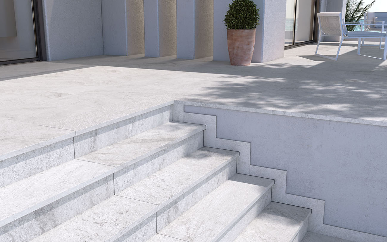 La tendencia de integrar visualmente espacios de interior y exterior se consigue utilizando el mismo pavimento, lo que nos proporciona armonía y gran amplitud. indicado para interiores, realizado en pasta porcelánica con propiedades antibacterianas y antivíricas y disponible en formatos XXL para bases y peldaños.