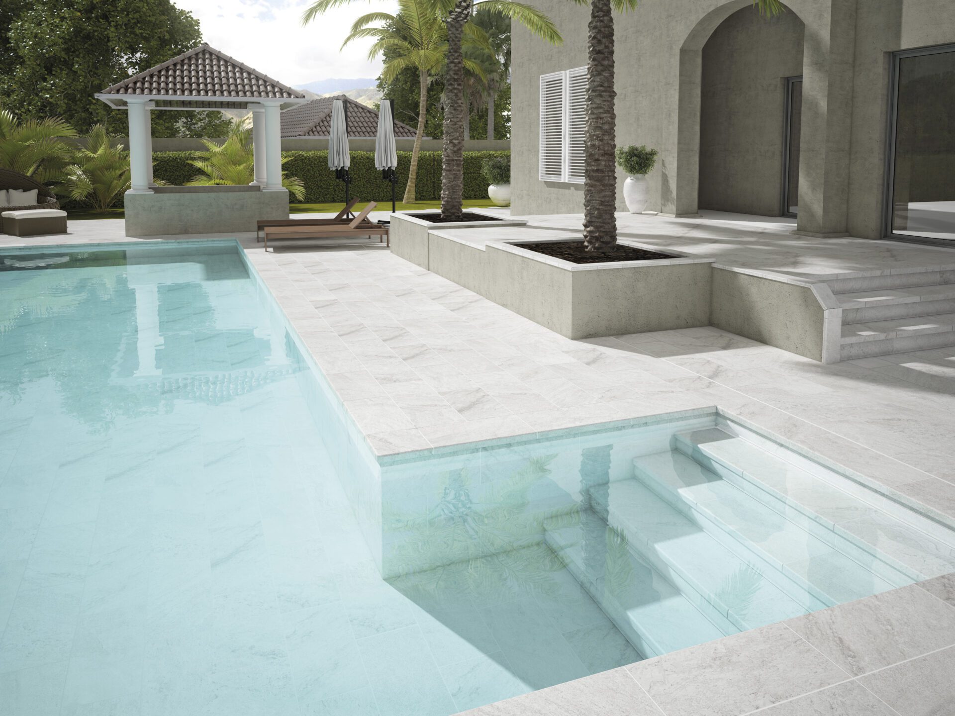Colores claros, luminosos y gráficas elegantes. Piezas especiales disponibles. Indicado para revestir piscinas. Dispone de peldaños de hasta 1600 mm en diferentes formatos.