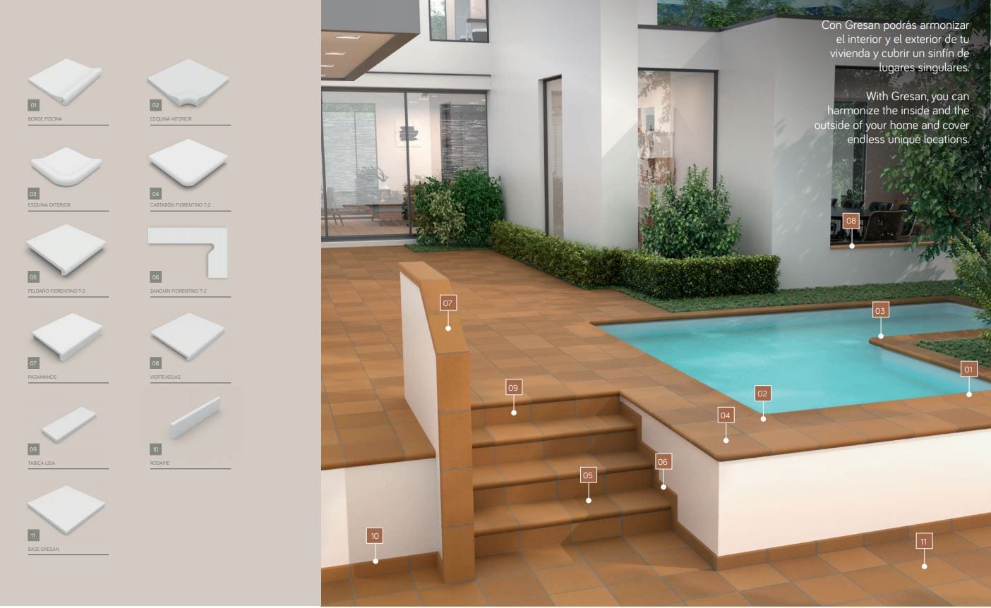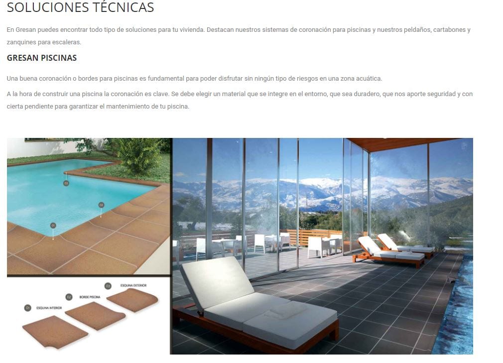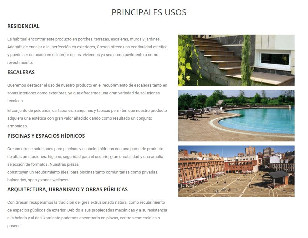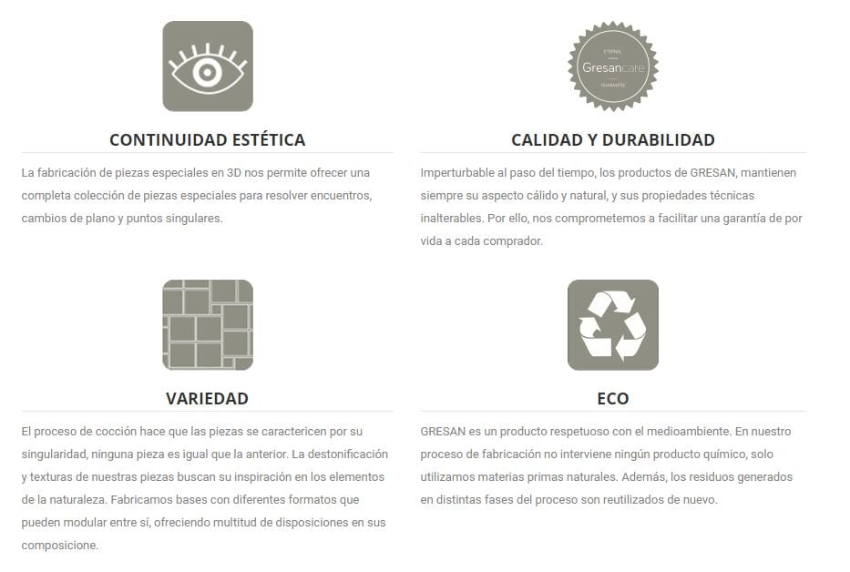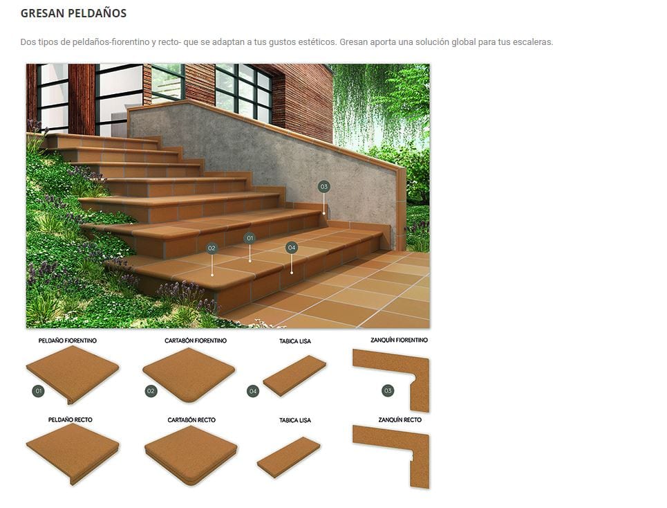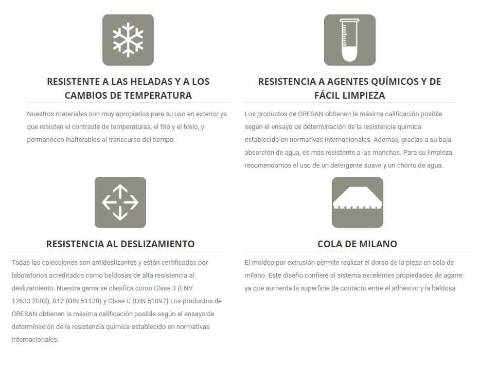 30,51 € – 40,35 € / m2 (IVA Incluido)La Serie GRESAN es un azulejo de Gres extruido antideslizante. Es una serie de Extrusión Natural optima para exteriores y zona públicas. De fácil mantenimiento y perdurabilidad. Excelentes características técnicas fruto de un elaborado sistema productivo. Formatos y colores disponibles: