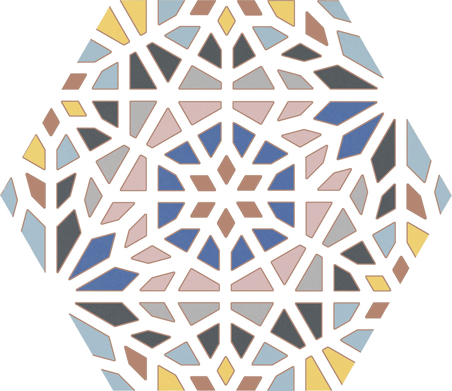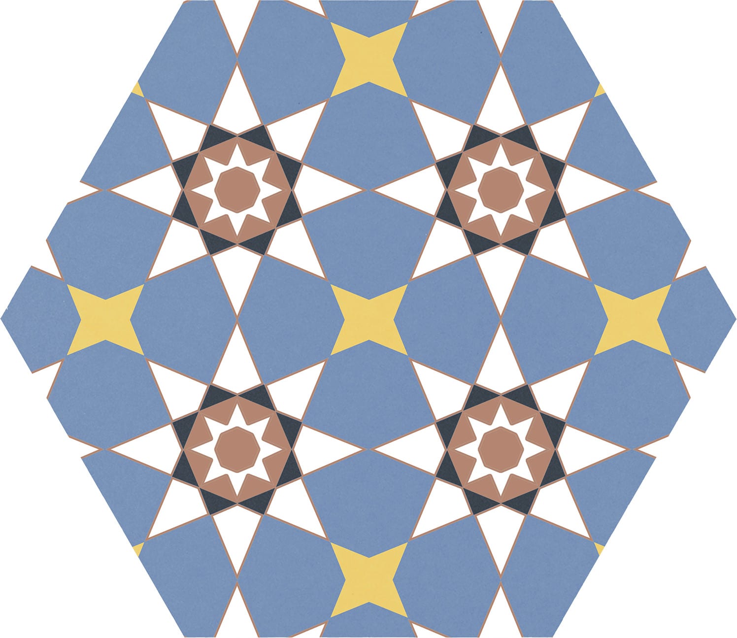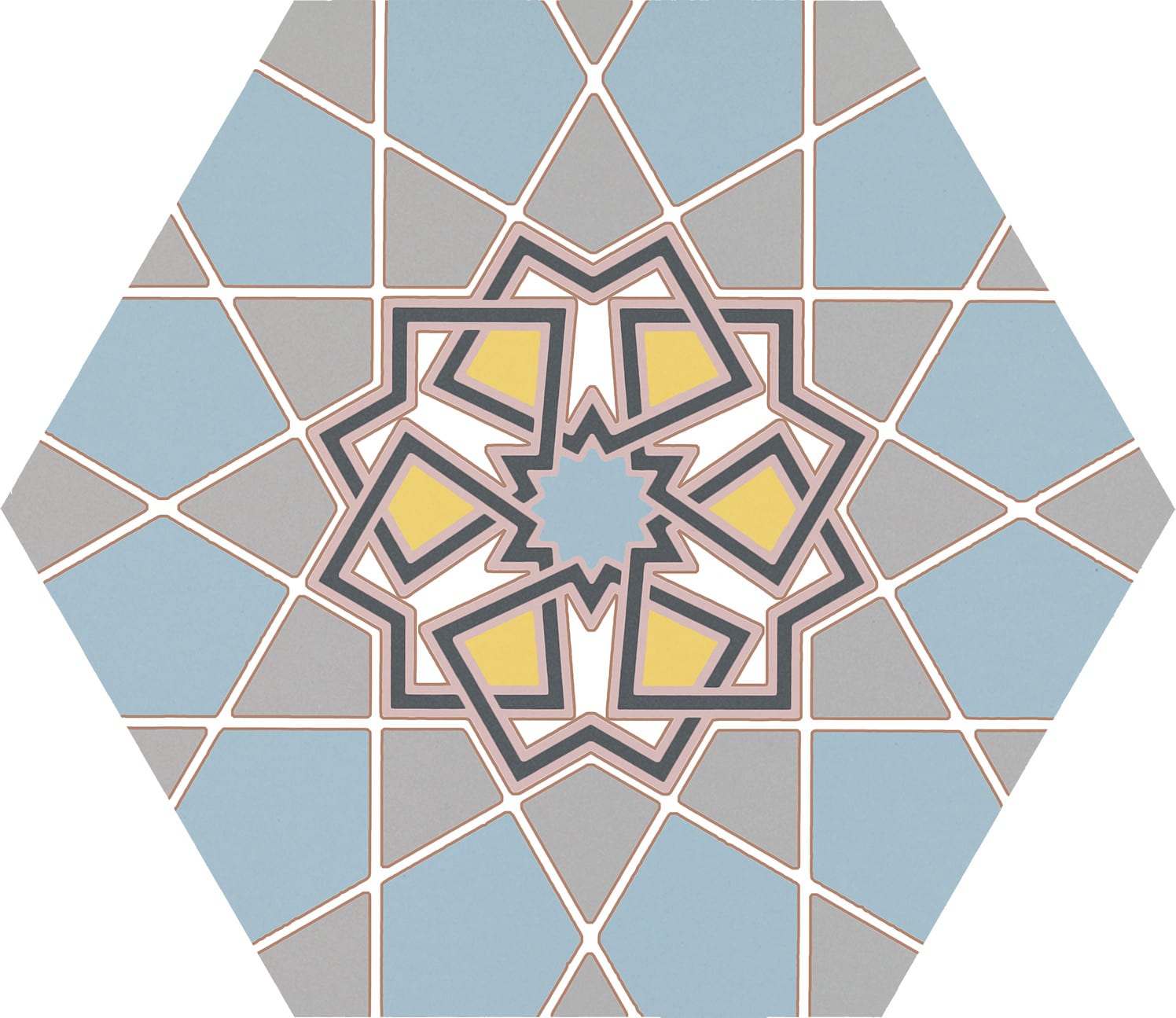 Serie KASBAH MIX . Azulejo porcelánico tipo hidráulico en formato 22×25 hexagonal, Presenta un acabado mate.