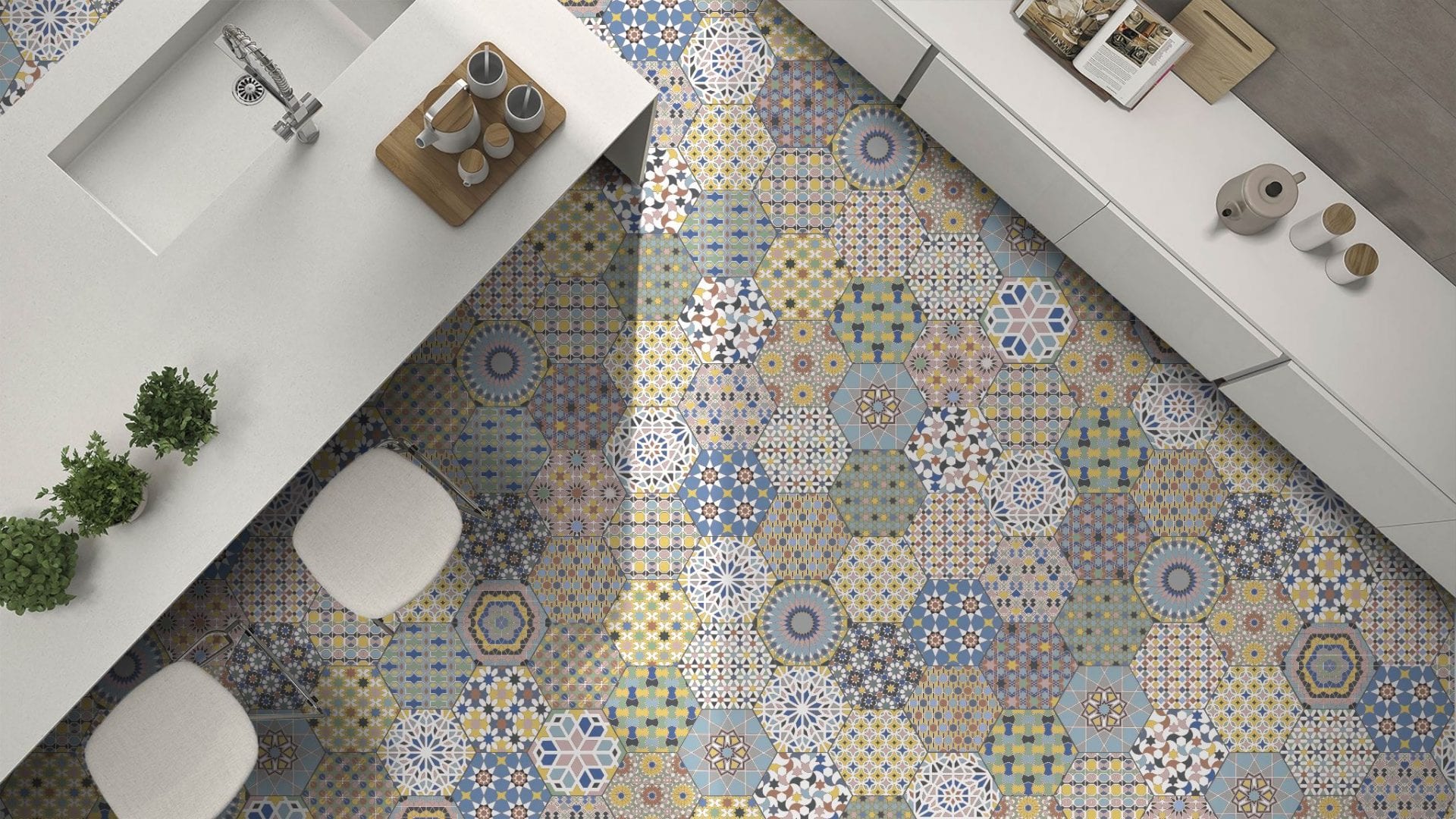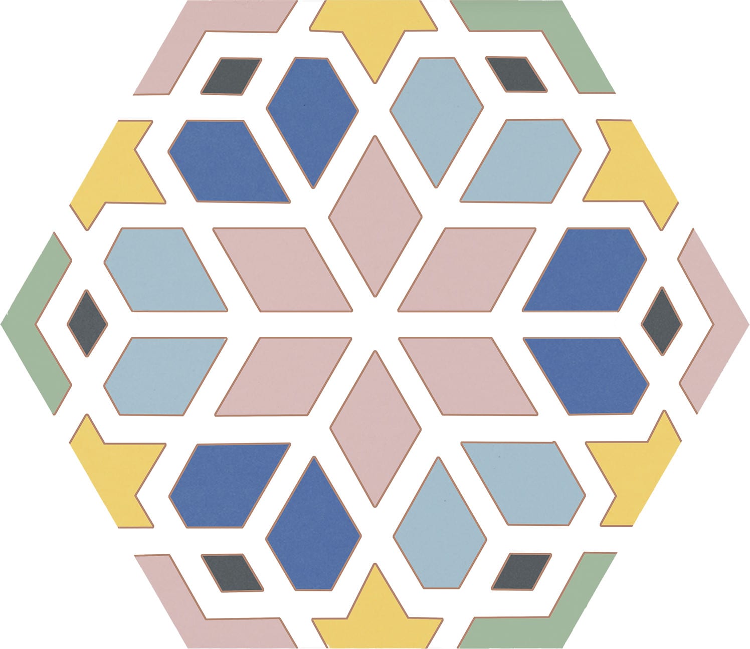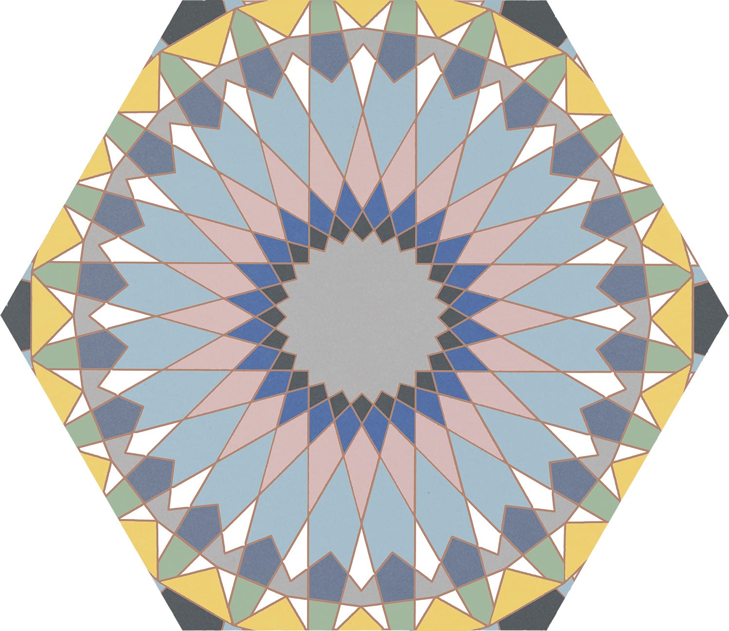 Serie KASBAH MIX . Azulejo porcelánico tipo hidráulico en formato 22×25 hexagonal, Presenta un acabado mate.