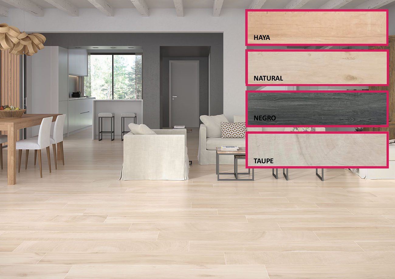 Colores: Haya, Natural, Taupe. Formato: 23×120 rectificado. M2 por caja: 1,12. Acabado: mate (natural).