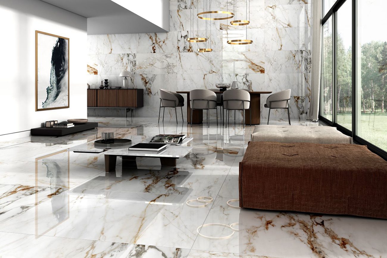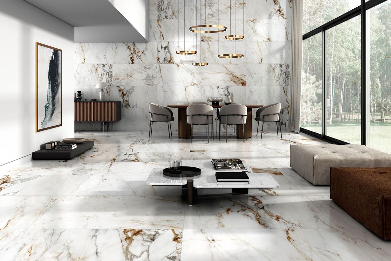 Este azulejo porcelánico es adecuado tanto para revestimiento como para pavimentación, y su diseño se presenta en diferentes gráficas para dar una sensación de realismo al imitar el aspecto del mármol natural.