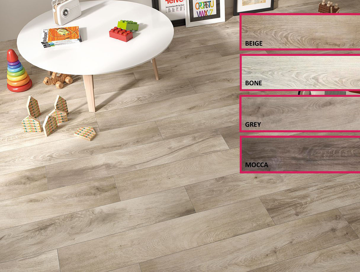 11,24 € – 18,59 € / m2 (IVA Incluido)La Serie Myrcella es un azulejo imitación madera disponible en porcelánico en formato 23×120, rectificado, y en gres de pasta roja en formato 20,5×61,5. Presenta un acabado mate en todos sus colores: Beige, Bone, Mocca, Grey. Perfecto para la colocación en suelos de interior.