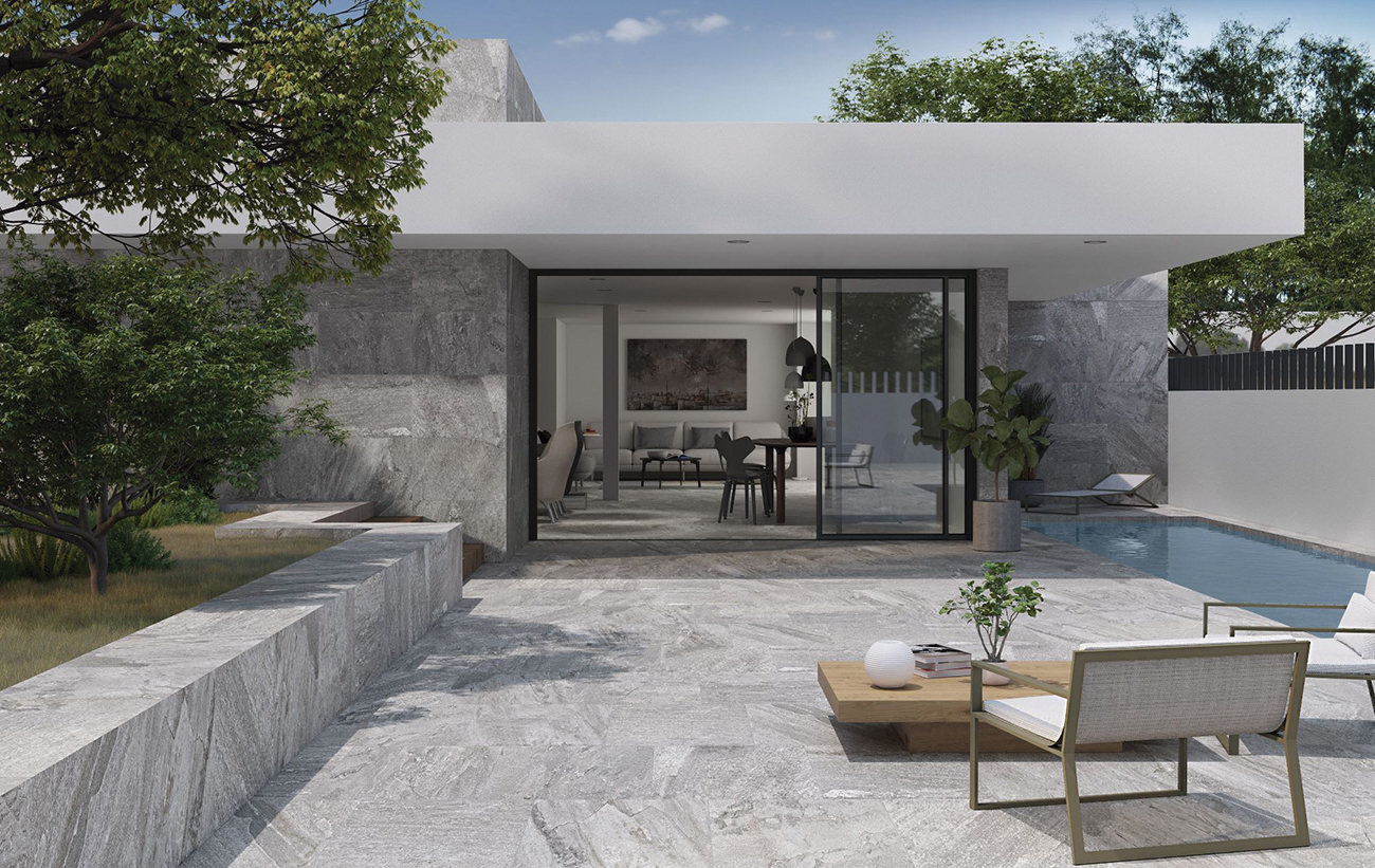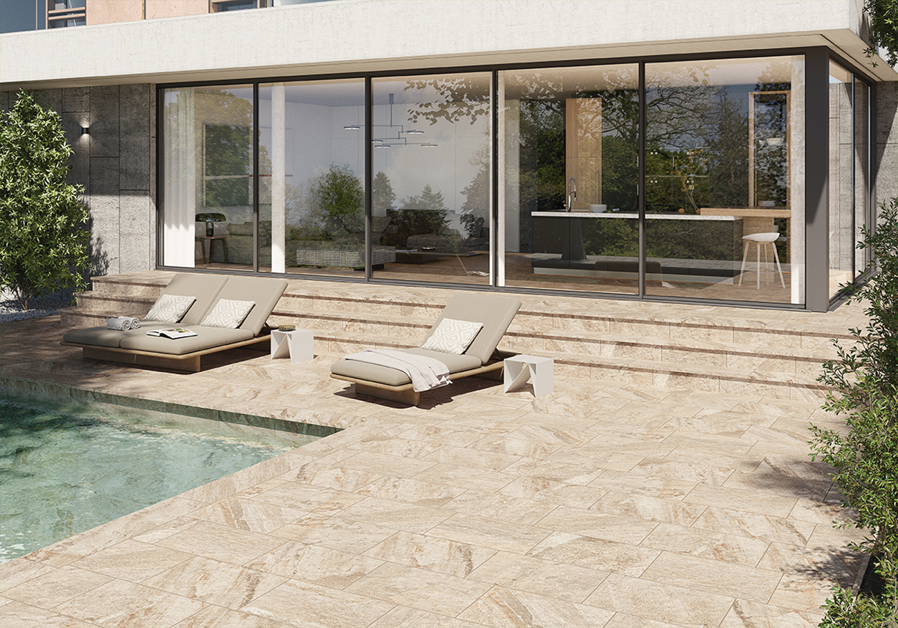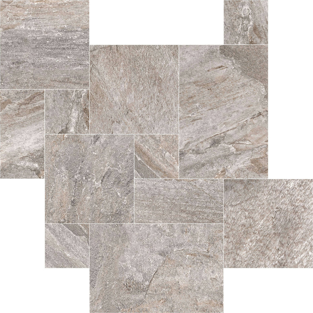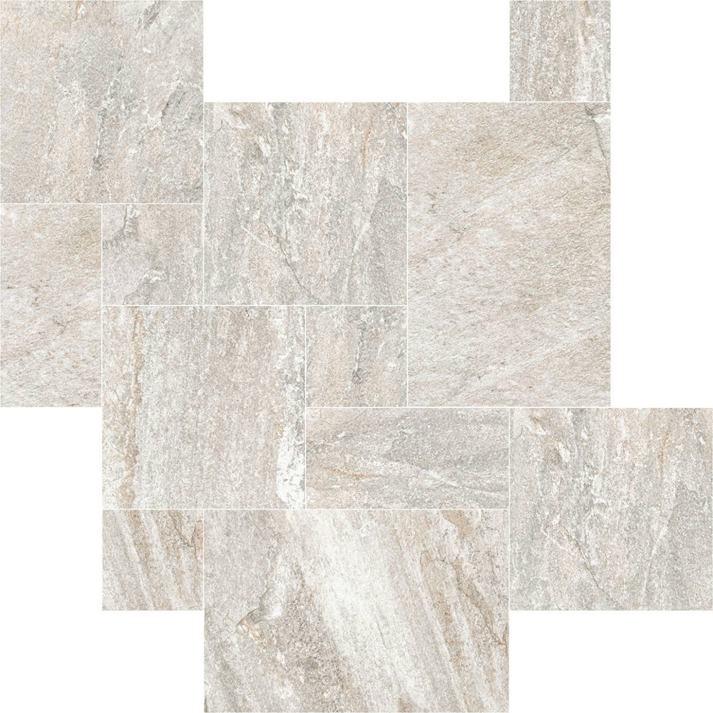 Oberon está disponible en formatos versátiles, incluida una opción modular, que permite crear diseños personalizados y aumentar el realismo de los espacios gracias al efecto multiformato, simulando las disposiciones irregulares de la piedra natural. Con un espesor de 10 mm, esta serie es resistente y funcional, adaptándose a las exigencias de zonas de alto tránsito o condiciones climáticas adversas.