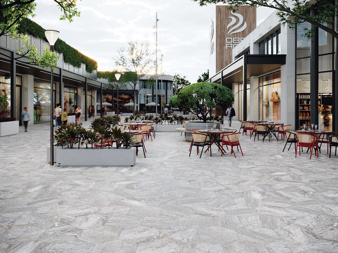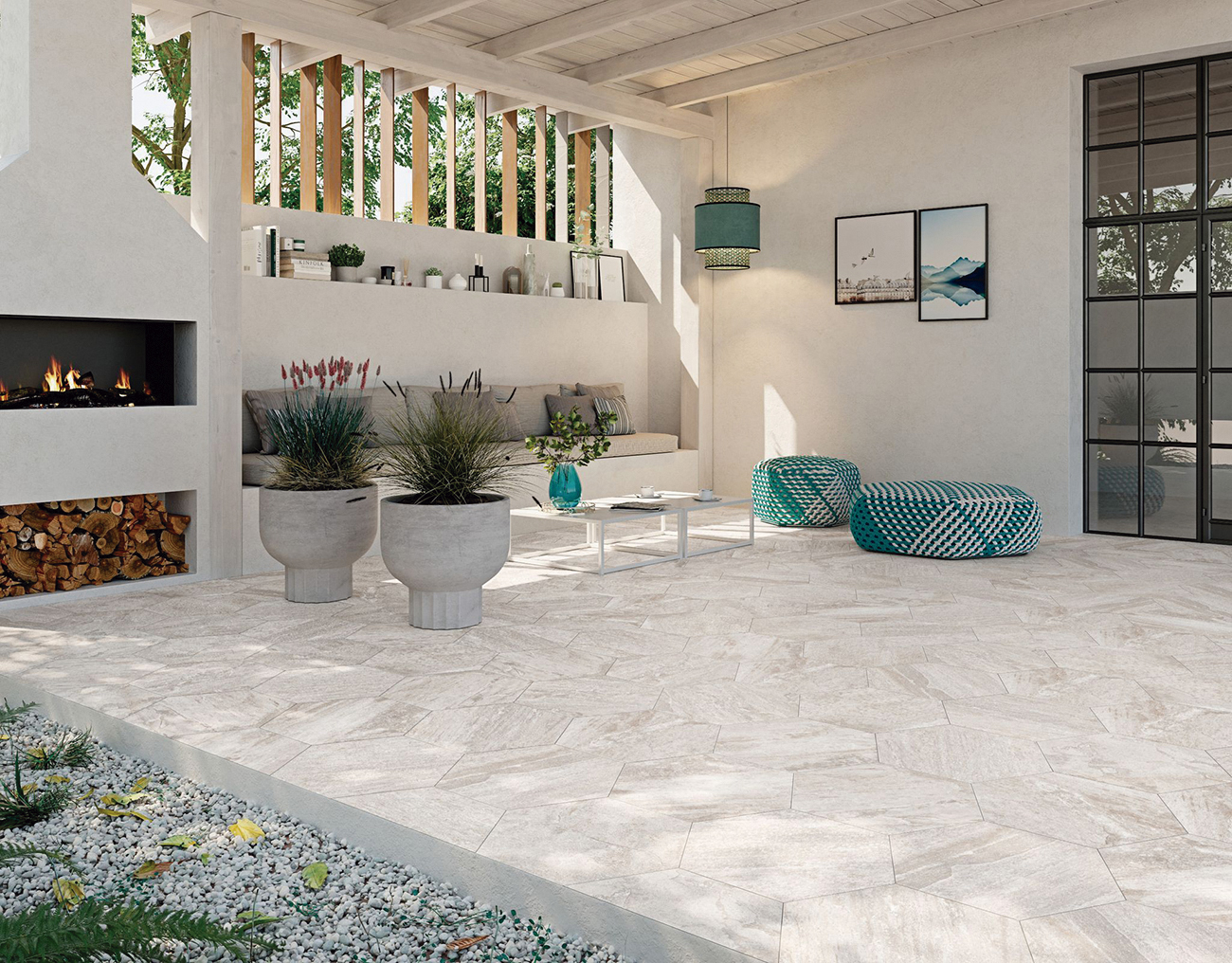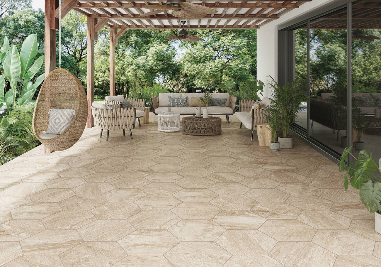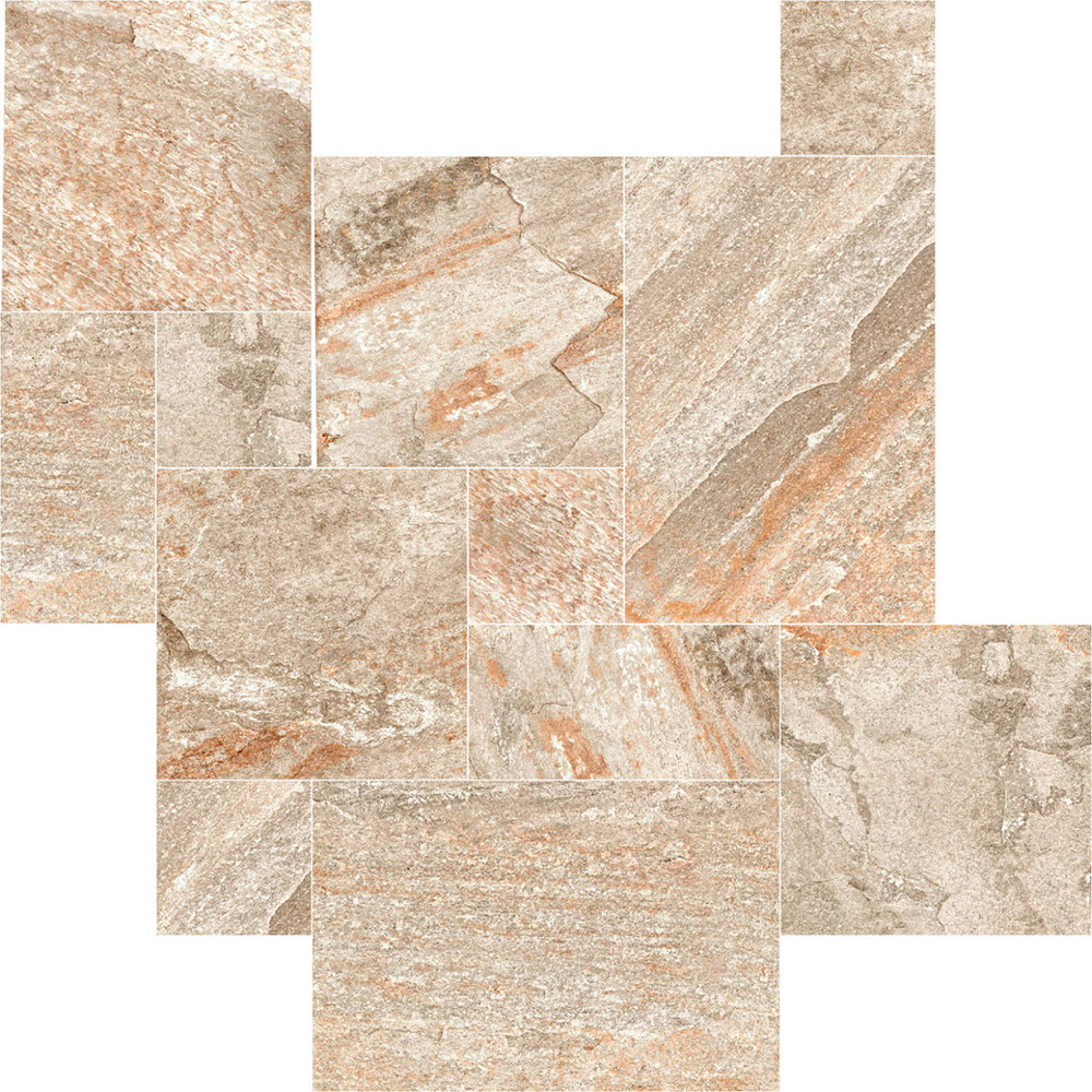 Oberon está disponible en formatos versátiles, incluida una opción modular, que permite crear diseños personalizados y aumentar el realismo de los espacios gracias al efecto multiformato, simulando las disposiciones irregulares de la piedra natural. Con un espesor de 10 mm, esta serie es resistente y funcional, adaptándose a las exigencias de zonas de alto tránsito o condiciones climáticas adversas.
