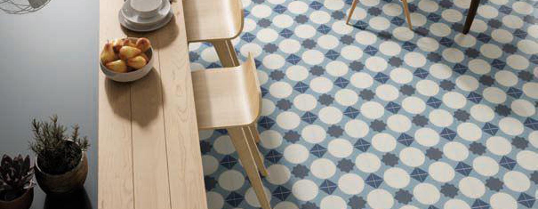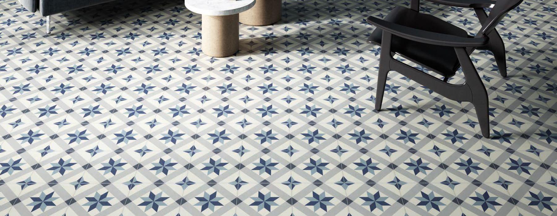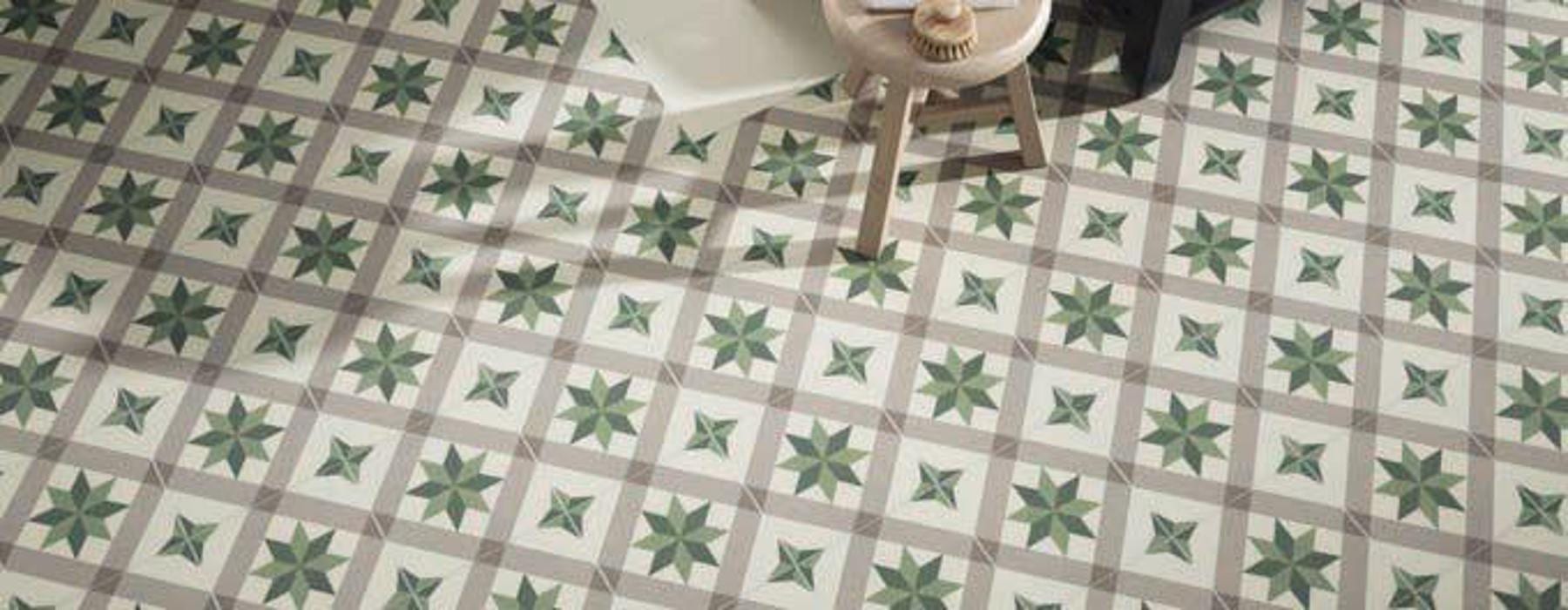Serie Rivera. Azulejo Porcelánico imitación hidráulico en formato 25×25, Presenta un acabado mate.