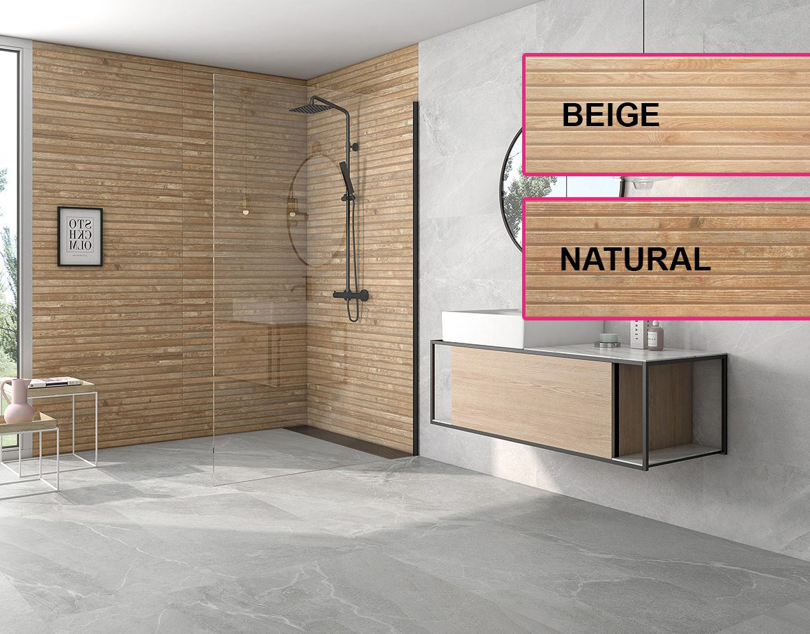 Serie TAPISO. Azulejo de pasta blanca rectificada imitación madera en formato 33.3×90, disponible en acabado mate. Esta serie nos ofrece dos bases de diferentes colores para combinar con 3 relieves a juego.