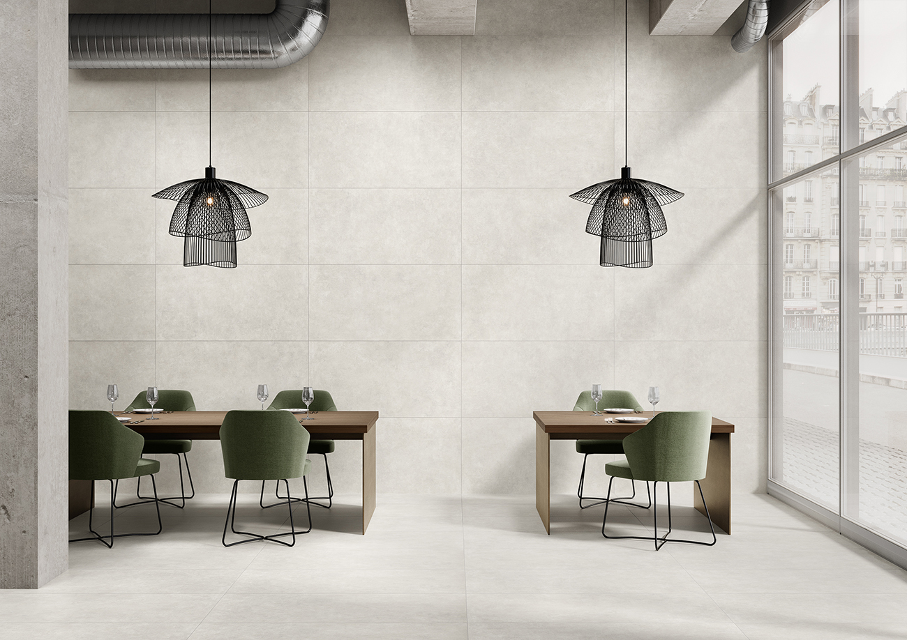 Formatos: 60×120 cm, 75×75 cm (antideslizante), 33,3×90 cm (revestimiento en pasta blanca rectificada)