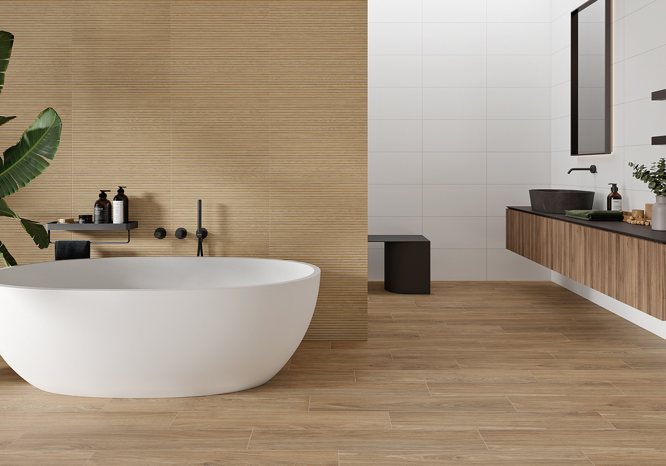 Disponible en formato 30×60 cm, la serie Wilde ofrece una opción versátil para revestimientos en áreas residenciales o comerciales. Los colores cold y warm abarcan desde tonos fríos y modernos hasta matices cálidos y acogedores, permitiendo crear combinaciones visuales que se adaptan a cualquier estilo decorativo. Estos colores, junto con su acabado mate, realzan la naturalidad y autenticidad de la textura de madera en relieve.